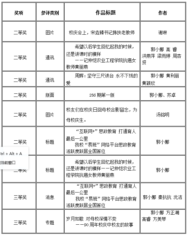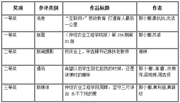 另外,“2017年度广东省高校校报好新闻”评选活动也于近日揭晓,仲恺农业工程学院校报有9项作品获奖,其中二等奖7项,三等奖2项(详见表格二)。