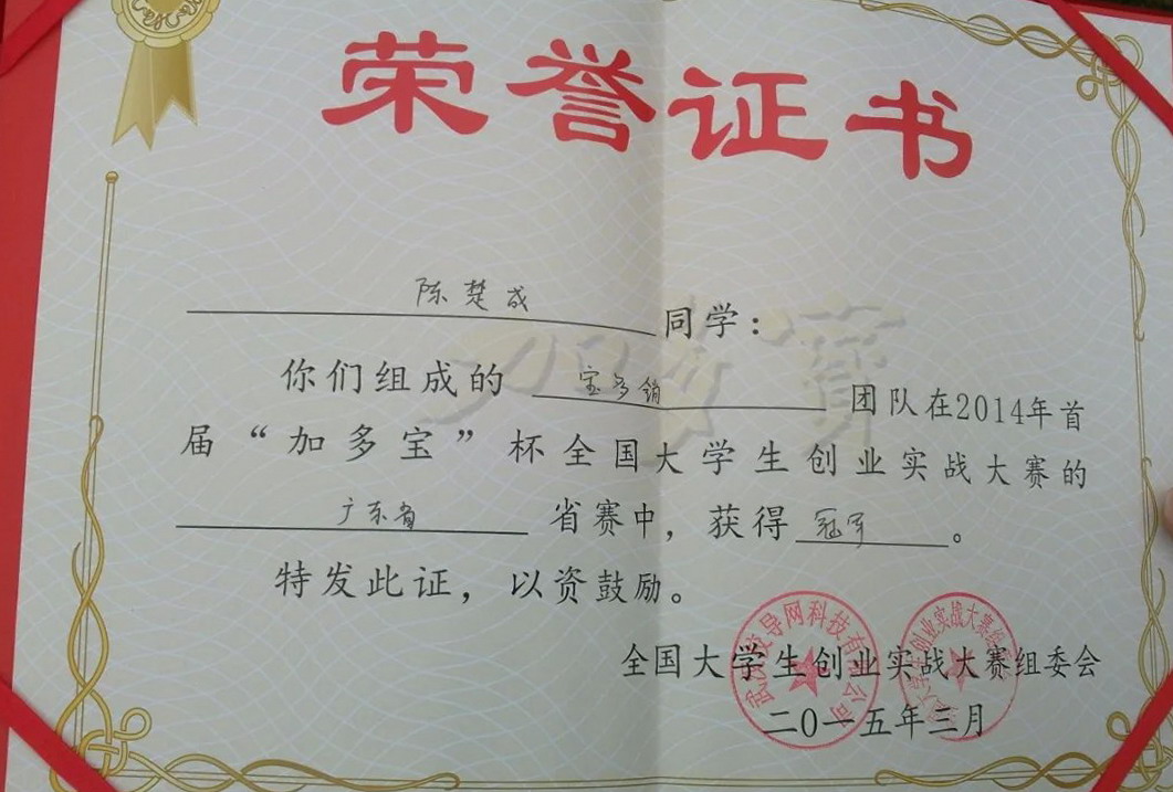 3月28日,首届“加多宝”杯全国大学生创业实战大赛广东省决赛在广东工业大学举行。我校机电工程学院能源131班陈楚成同学率领的“宝多销”创业实战团队过关斩将,战胜了来自华南理工大学、中山大学、暨南大学、华南农业大学、广东商学院、广东工业大学等高校的学生团队,最终取得 “加多宝”杯广东省总决赛冠军,并将代表广东赛区进军全国总决赛。