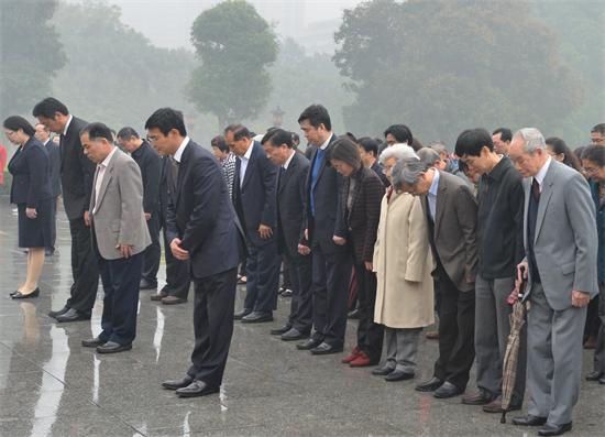 在濛濛细雨中,参加仪式的各界人士在孙中山先生像前肃立并三鞠躬,并绕行一周瞻仰铜像,深切缅怀孙中山先生。