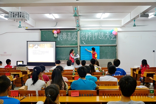 评选大会以PPT展示的形式向大家简单介绍入选老师的个人简介、教学理念教学事迹以及工作经验等,以使学生代表能更好地了解各位老师从而选出自己心目中最喜爱的老师。紧接着,主持人宣读投票细则和注意事项后进入投票环节。为体现活动的透明公正,又设了唱票环节。在此环节中,工作人员现场统计各位老师所得票数,同时结合两个校区的票数以及微博投票情况,得出评选结果并以PPT形式展现。