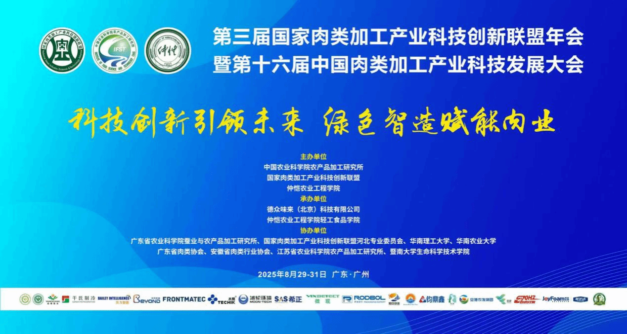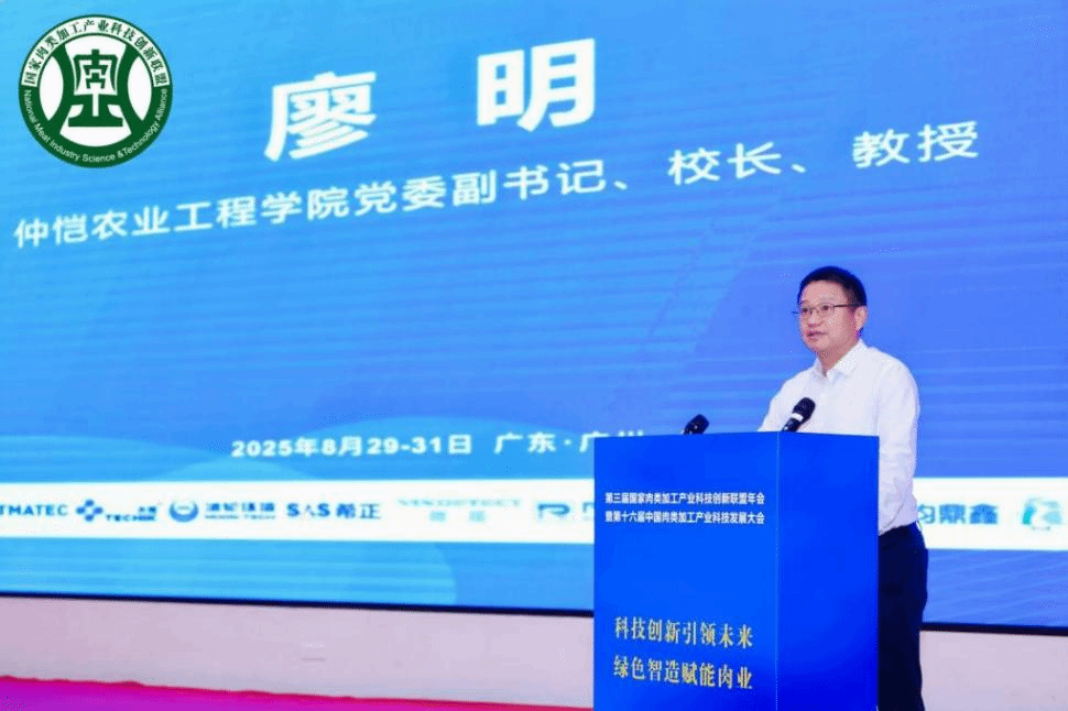 2025年8月30日,第三届国家肉类加工产业科技创新联盟年会暨第十六届中国肉类加工产业科技发展大会在广州开幕。本届大会由我校和中国农业科学院农产品加工研究所、国家肉类加工产业科技创新联盟主办,由德众味来(北京)科技有限公司和我校轻工食品学院承办,广东省农业科学院蚕业与农产品加工研究所、广东省农业科技创新联盟等协办,汇聚了来自全国各地食品领域的专家、学者及企业代表400余人,共襄盛会。