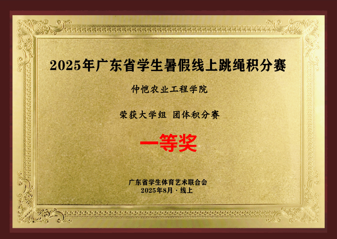 比赛期间,体育学院每天关注全校学生参与情况和学校排名情况,广泛发动、鼓励动员同学们持续参与活动。经过21天的激烈角逐,学校荣获2025年广东省学生暑假线上跳绳积分赛团体一等奖(大学组)。