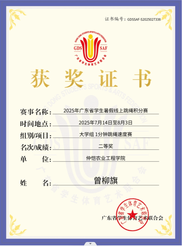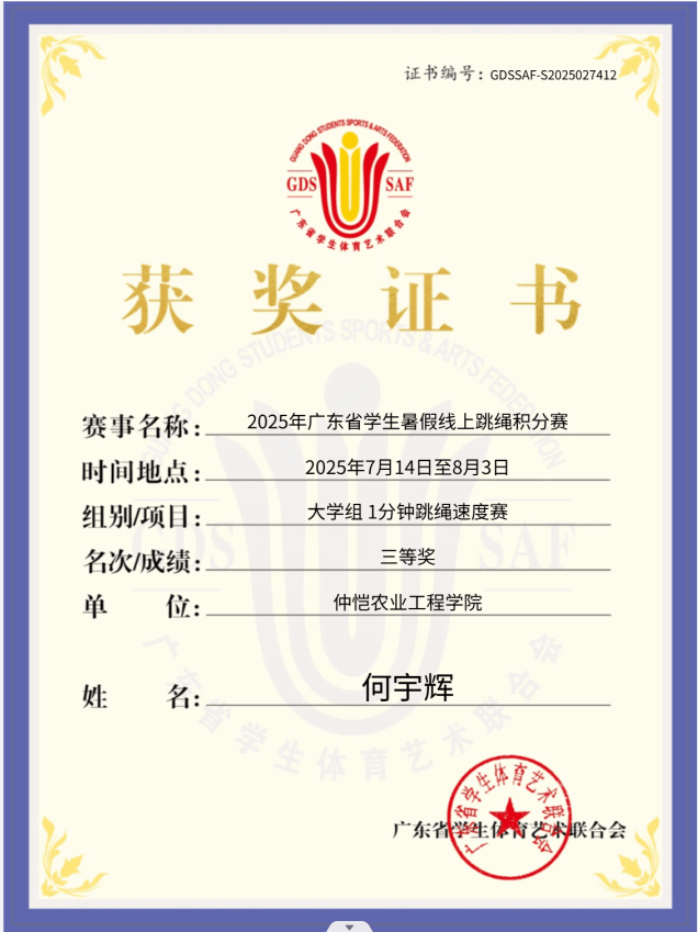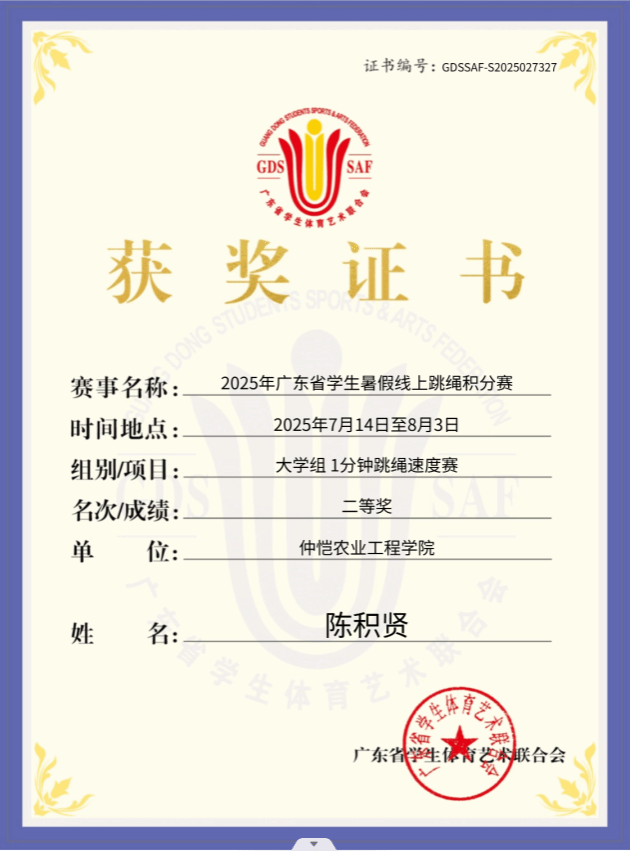 由广东省学生体育艺术联合会主办、广东跳绳技术研究院承办的2025广东省学生暑假线上跳绳积分赛于2025年7月14日至8月3日期间举行,学校高度重视学生暑假期间课余运动锻炼,安排体育学院负责以及各学院积极跟进,积极动员仲恺学子响应号召,积极参加比赛,在暑假期间养成居家运动健身的良好习惯,以良好的精神面貌迎接新学期的学习生活。