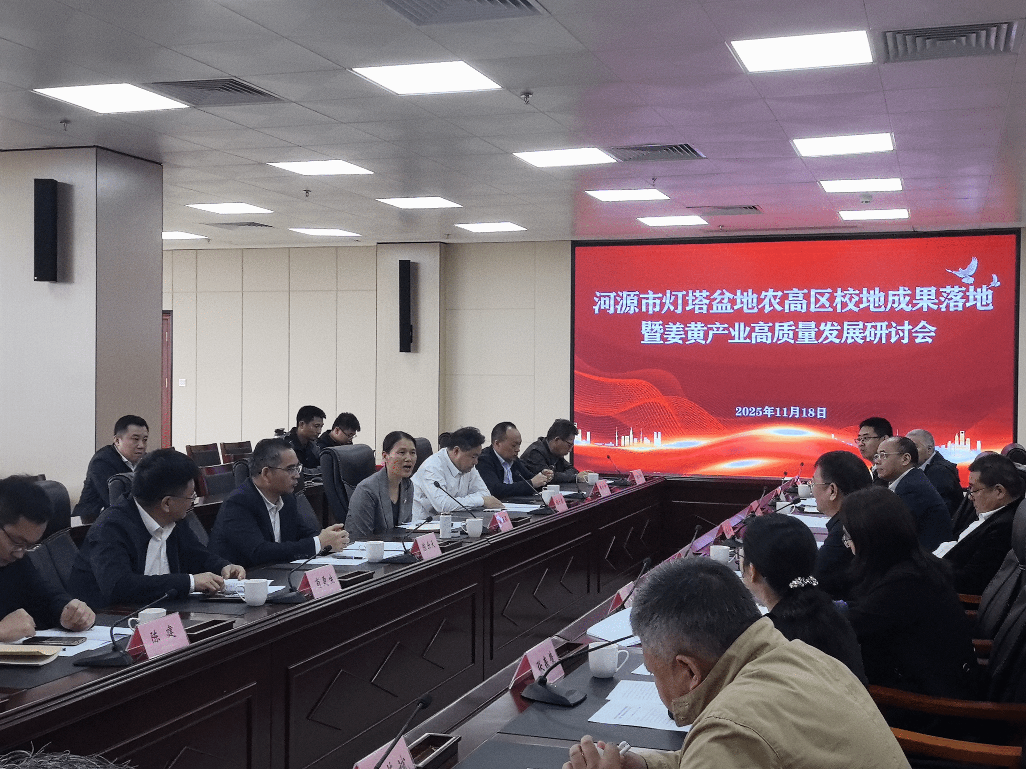11月18日,河源市灯塔盆地农高区校地合作成果落地暨姜黄产业高质量发展研讨会在河源成功举办。我校党委常委、副校长徐玉娟,原副校长肖更生应邀出席,共同见证灯塔盆地姜黄产业科创工程中心揭牌,并围绕姜黄产业的高质量发展路径展开深入交流。