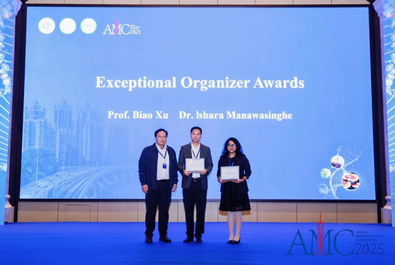 大会还颁发了“优秀组织者奖”,学校农业与生物学院副院长徐彪教授,以及北京市农林科学院副研究员Ishara Manawasinghe,因在会议筹备中发挥关键作用而获此殊荣。亚洲菌物协会秘书长Nguyen Duc Hoang Pham为获奖者颁奖。