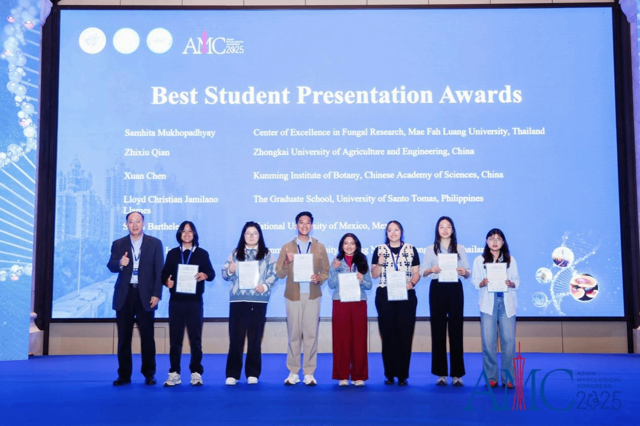本届大会设立了“优秀学生报告奖”,该奖项旨在表彰在学术研究和报告表现方面表现突出的青年学生,展现大会对培养菌物学后备人才的重视。来自仲恺农业工程学院、泰国皇太后大学、中国科学院昆明植物研究所、菲律宾圣托马斯大学、墨西哥国立自治大学、泰国国立法政大学、贵州大学的7位学生获奖。中国菌物学会理事长郭良栋为获奖者颁奖。
