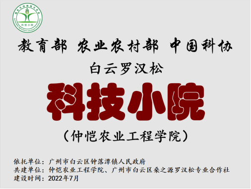 教育部、农业农村部、中国科协三部委2022年支持建设的首批科技小院“广东白云罗汉松科技小院”,由我校和广州市白云区燊之源罗汉松专业合作社、广州市白云区钟落潭镇人民政府三方合作共建,坚持以“注重实践治学问,扶助农工育英才”为办院理念,旨在深化研究生培养与罗汉松产业发展研究。该小院由我校马克思主义学院院长、硕士生导师、博士后合作导师蔡立彬教授担任首席专家,广州市白云区燊之源罗汉松专业合作社理事长曾令华与我校马克思主义学院专任教师周映萍作为首批驻院专家共同参与建设。该科技小院曾获得2024年全国优秀科技小院案例。