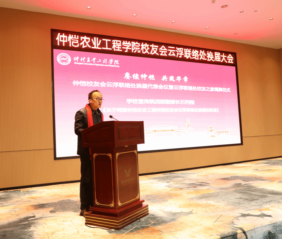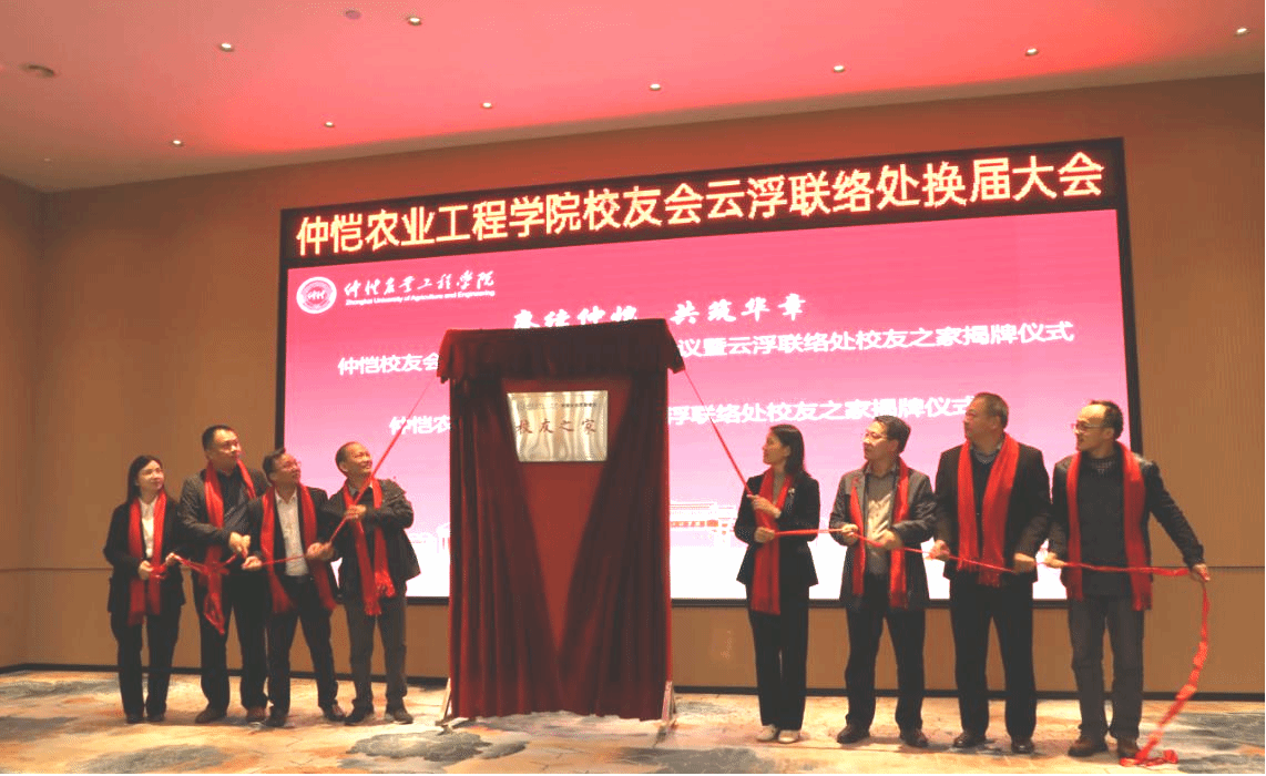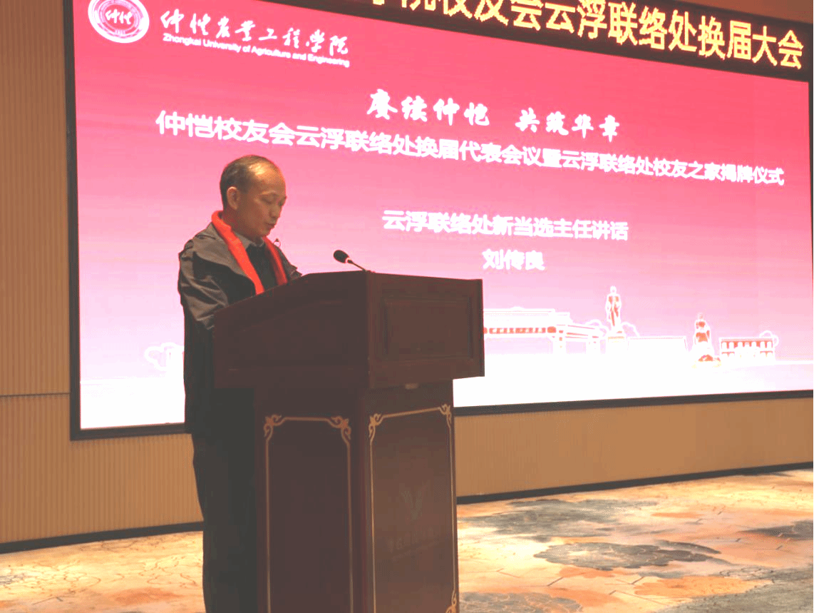 会上宣读了《关于同意仲恺农业工程学院校友会云浮联络处换届的批复》。经学校校友会云浮联络处换届会议推选,刘传良任主任,林锦波、徐鉴洪、黄庆莉、简海英、李志灵、关国永、赵允梅任副主任,潘启标任秘书长,张婷任副秘书长,梁中尧、练石勇、郑树发、黄星源、陈石贤、黎炳尧、赖雅雯任理事。
