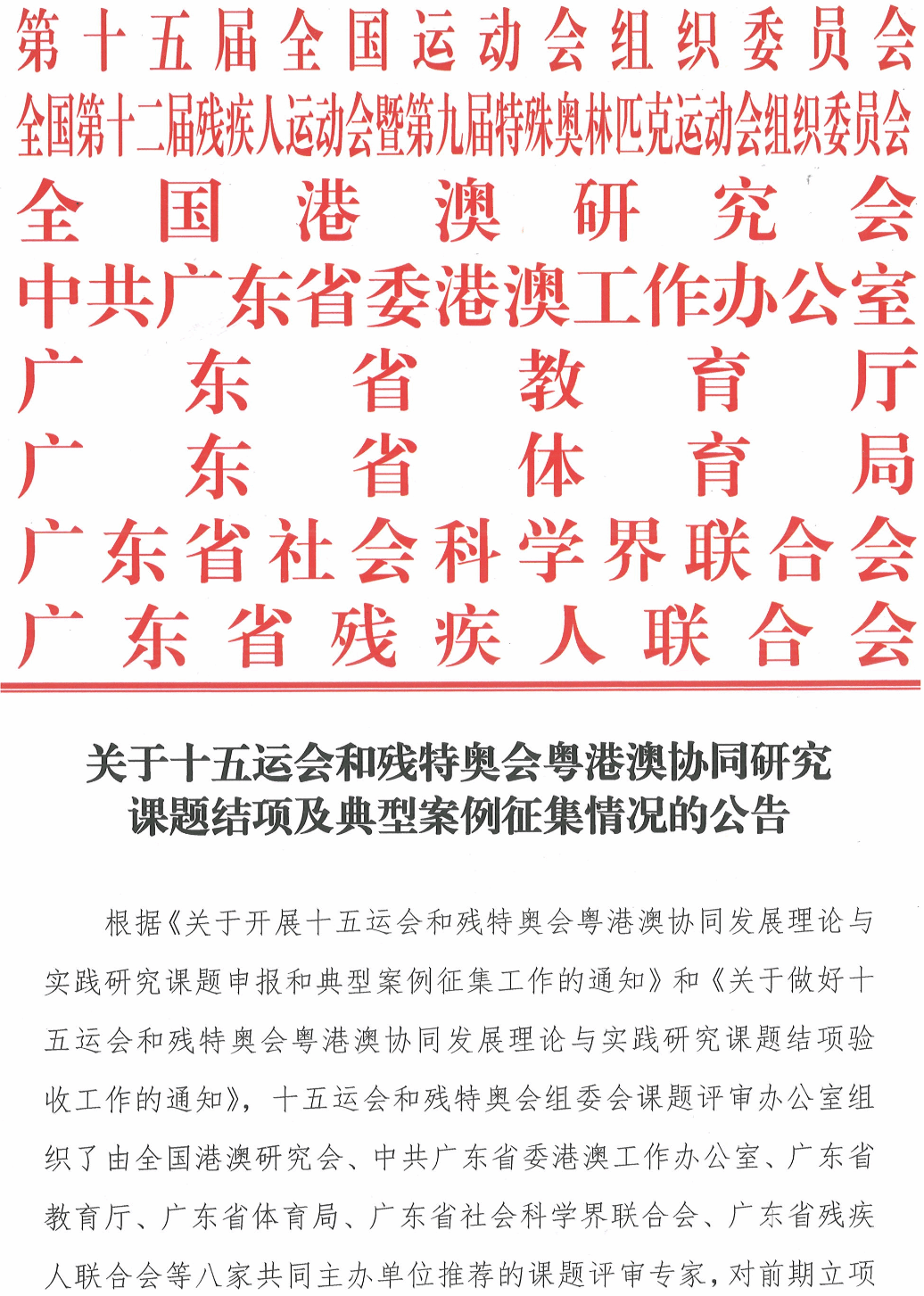 近日,第十五届全国运动会组织委员会、全国第十二届残疾人运动会暨第九届特殊奥林匹克运动会组织委员会联合发布《关于十五运会和残特奥会粤港澳协同研究课题结项及典型案例征集情况的公告》。何香凝艺术设计学院在课题研究和典型案例评选中表现突出,喜获3项重要成果。