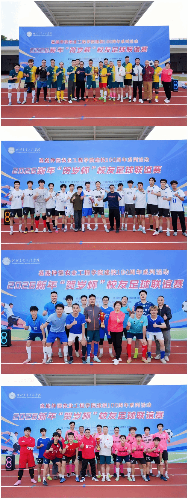 绿茵传情,共赴百年之约。1月18日,喜迎学校建校100周年系列活动之2026新年“贺岁杯”校友足球联谊赛在白云校区霍英东文体中心运动场开赛。学校党委副书记、校长廖明,党委常委、宣传统战部部长曾献尼,校友事务部部长陈晓玲,体育学院院长李尚胥,来自各地的校友代表、学校教职工等近百名师生校友齐聚一堂,以足球为媒重温校园岁月,用竞技热忱点燃百年校庆的预热氛围。