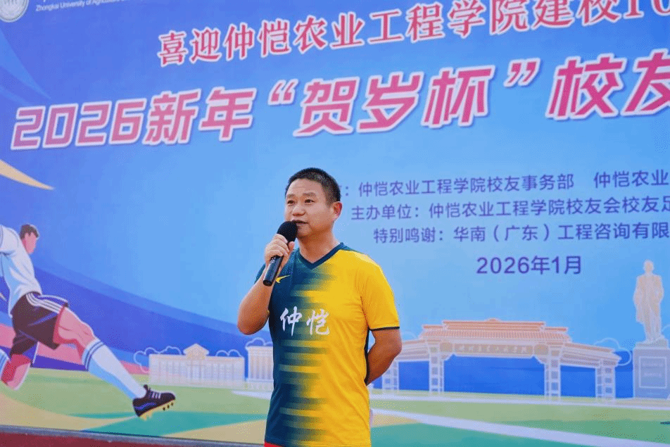 廖明为活动致辞,他代表学校向返校的校友们致以热烈的欢迎和诚挚的新年问候。他指出,校友是母校最宝贵的财富,是母校事业发展最值得信赖与依靠的中坚力量,此次足球联谊赛既是一场体育竞技盛会,更是凝聚师生情谊、传承仲恺精神的重要载体,希望全体球员能在奔跑与协作中重温青春岁月、凝聚奋进力量。致辞结束后,廖明手持足球步入球场中央,在全场观众的热切期盼下一脚开出,正式拉开了本次联谊赛的序幕。