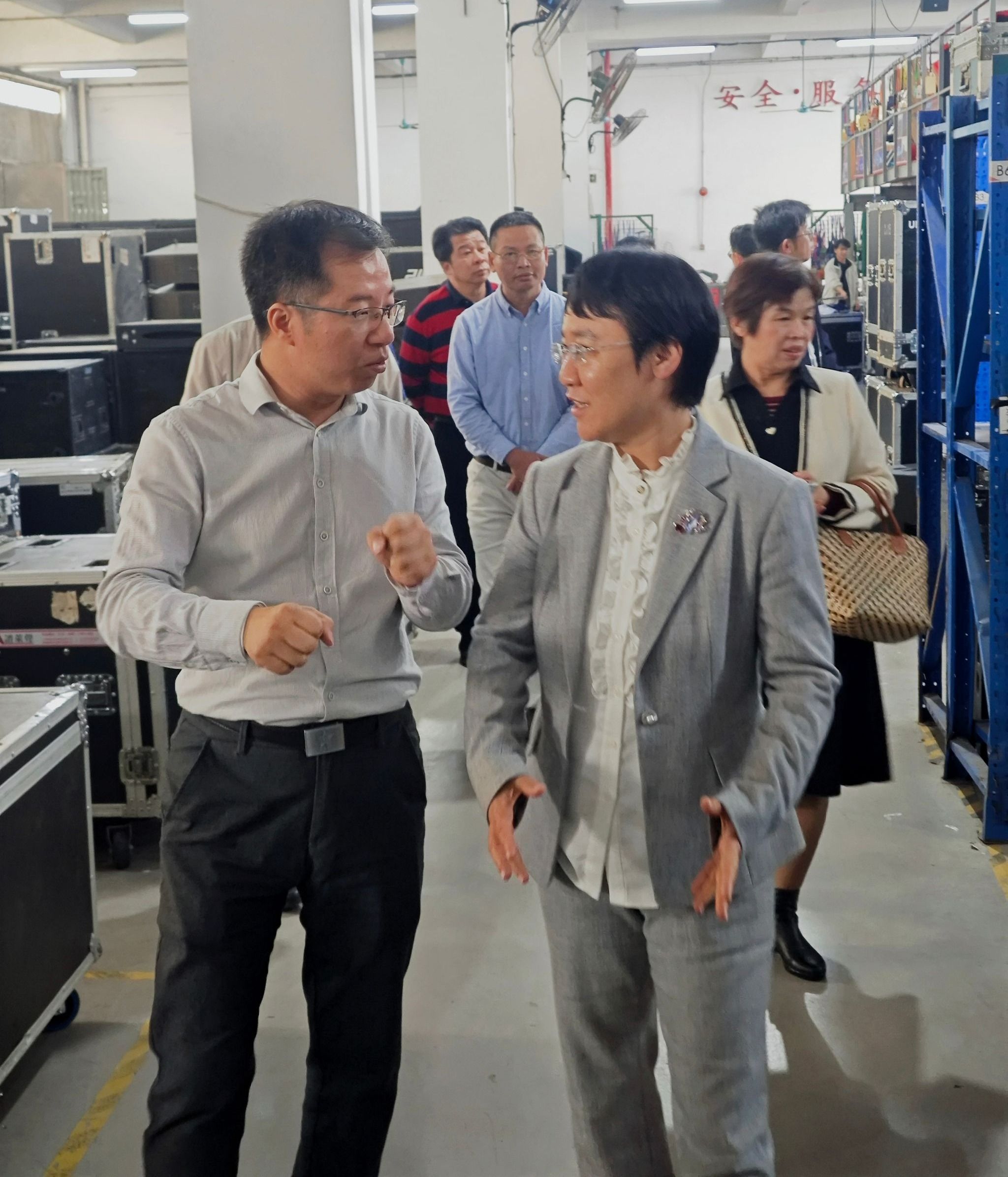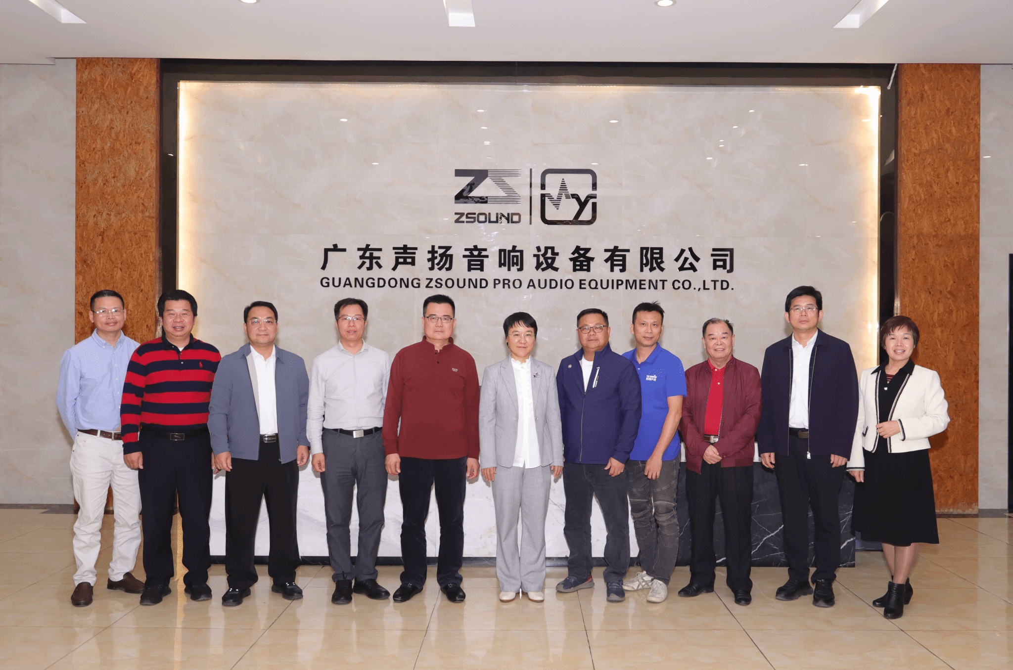 翟雪梅一行抵达广东谱莱声演出设备有限公司,受到校友们的热情迎接。在声谱集团联合创始人黄达荣(农学01届)、林海彬(工厂化00届)、周小古(制冷99届)、潘树彬(外向型经济00届)等校友陪同下,翟雪梅先后参观了谱莱声演出设备展示区、声扬音响研发设计和生产车间,详细了解声谱集团在专业音响、灯光设备研发、生产制造、工程设计与文化策划等方面的发展情况,对企业坚持自主创新、深耕行业二十余载所取得的成就表示高度赞赏。