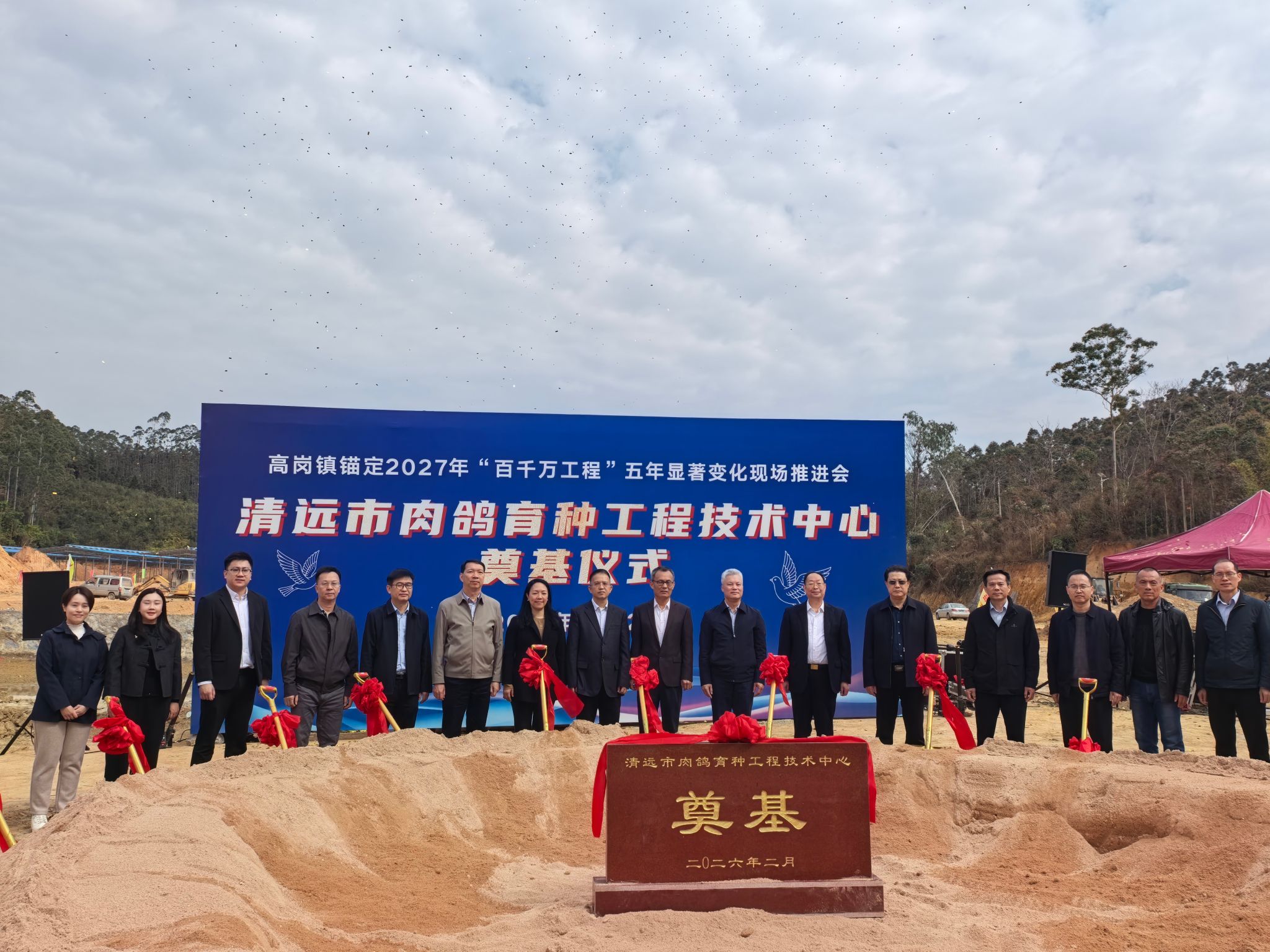 在活动现场,张文峰和与会领导共同为清远市肉鸽育种工程技术中心奠基培土,挥锹铲沙、共植基石,标志着该中心正式启动建设。清远市肉鸽育种工程技术中心是由佛冈县高岗镇政府、久臻畅农牧科技(佛冈县)有限公司与我校三方深度协作共建的专业化肉鸽产业技术研发与服务平台。项目立足清远市肉鸽产业发展需求,以攻克产业育种核心技术、提升产业现代化水平为目标,依托佛冈省级祖代场的优质资源,着力打造功能复合、技术领先的肉鸽育种专业平台。在随后举行的高岗镇乡村振兴组团帮扶单位联席会议上,我校动物科技学院副教授梁雅妍代表学校与久臻畅农牧科技(佛冈县)有限公司签署共建清远市肉鸽育种工程技术中心协议。刘汉球对我校及组团单位长期以来支持高岗镇发展表示感谢。他指出,要深入学习贯彻习近平总书记关于“三农”工作的重要指示精神,聚焦肉鸽、豆腐、红薯、脆蜜金桔等特色产业,加快推动三产融合,助力“百千万工程”取得更大成效。