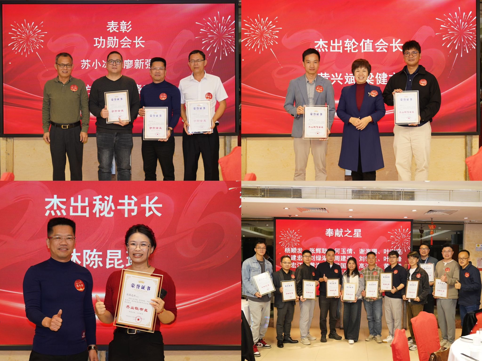 年会现场举行了隆重的表彰与交接仪式。学校领导为功勋会长苏小冰、廖新强、方俊贤、周晓武,杰出轮值会长黄兴斌、梁健文,杰出秘书长林陈昆琳,“奉献之星”杨顺发、张辉耿、何玉倩、谢海珊、叶澍坚等校友颁发荣誉证书,表彰他们为校友工作作出的积极贡献。