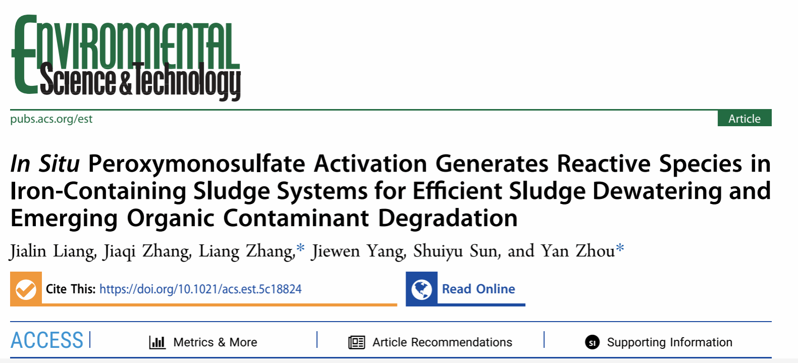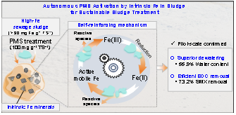 本次发表的论文题为“In Situ Peroxymonosulfate Activation Generates Reactive Species in Iron-Containing Sludge Systems for Efficient Sludge Dewatering and Emerging Organic Contaminant Degradation”。该研究聚焦污泥处理过程中脱水效率不足与新污染物去除困难等关键问题,提出了基于污泥内源铁原位活化过一硫酸盐(PMS)的新策略,实现了污泥脱水性能提升与新污染物高效去除的协同强化。
