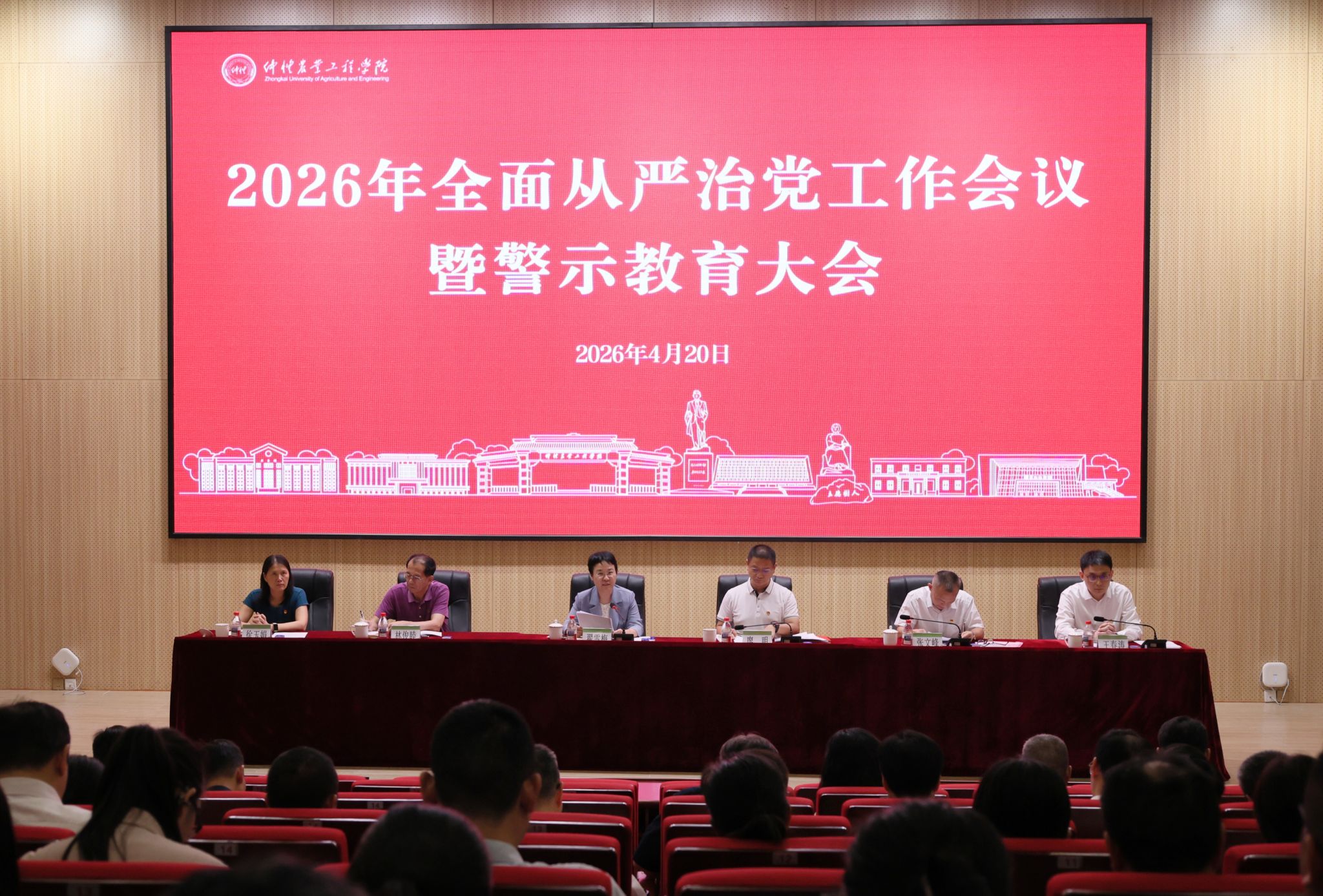 4月20日下午,学校在白云校区德新楼学术报告厅召开2026年全面从严治党工作会议暨警示教育大会,全面落实二十届中央纪委五次全会和十三届省纪委五次全会,以及2026年全省教育系统全面从严治党工作会议精神,总结学校2025年全面从严治党工作,部署2026年全面从严治党任务。党委书记翟雪梅出席会议并作全面从严治党工作报告,党委副书记、校长廖明传达上级有关会议精神。党委常委、副校长林俊睦、张文峰、徐玉娟,纪委书记王春涛出席会议。会议由张文峰主持。