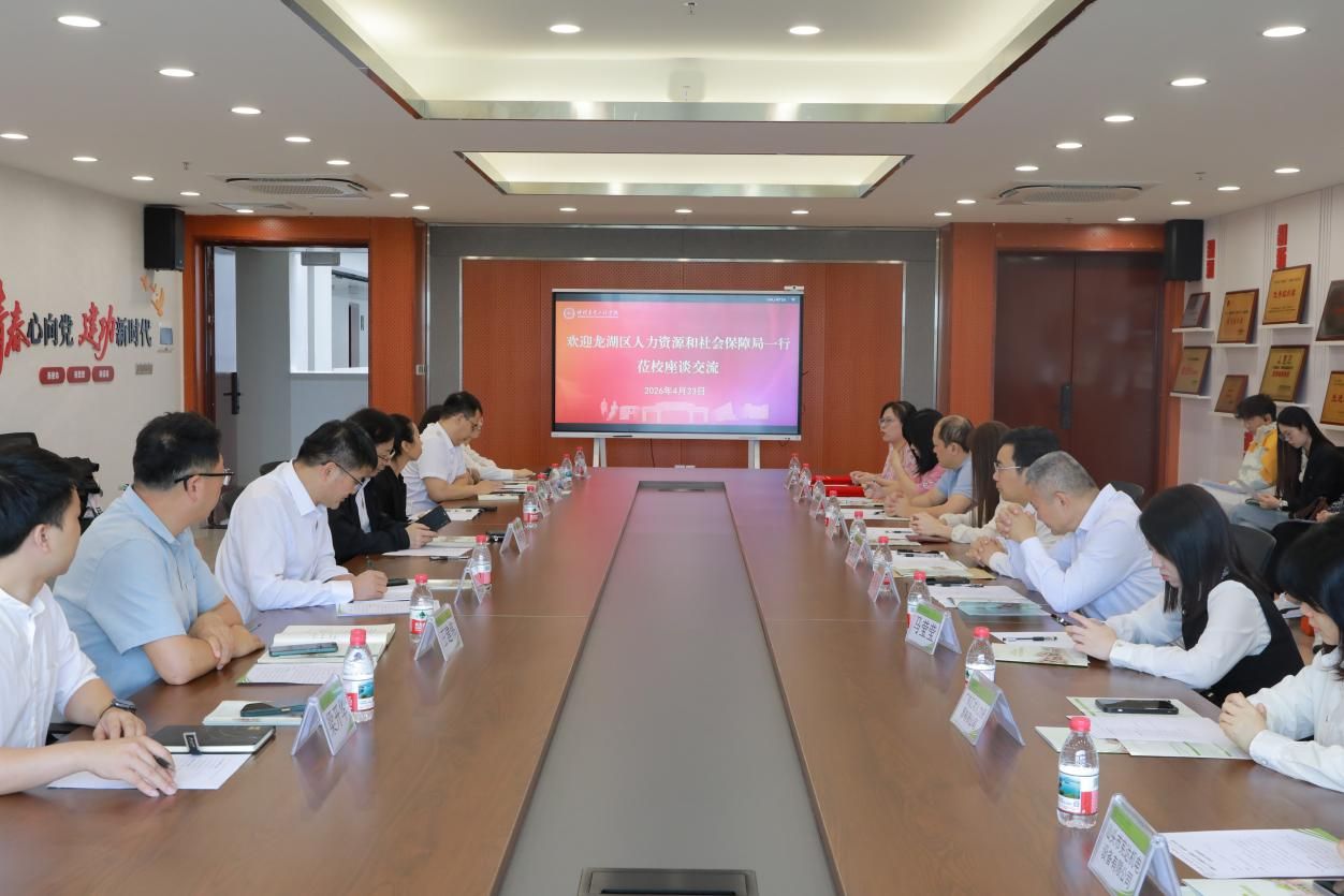 招聘会期间,同步举行政校企交流座谈会,汕头市龙湖区人力资源和社会保障局党组书记、局长陈小群,党组成员、副局长蔡镇勇一行,学校党委常委、副校长徐玉娟,学生工作党委书记、学生工作部(武装部)部长李伟东、副部长王建伟,自动化学院党委书记史孔仕,管理学院院长何琳,机电工程学院党委副书记赵栋,学生就业指导中心全体人员参加会议。