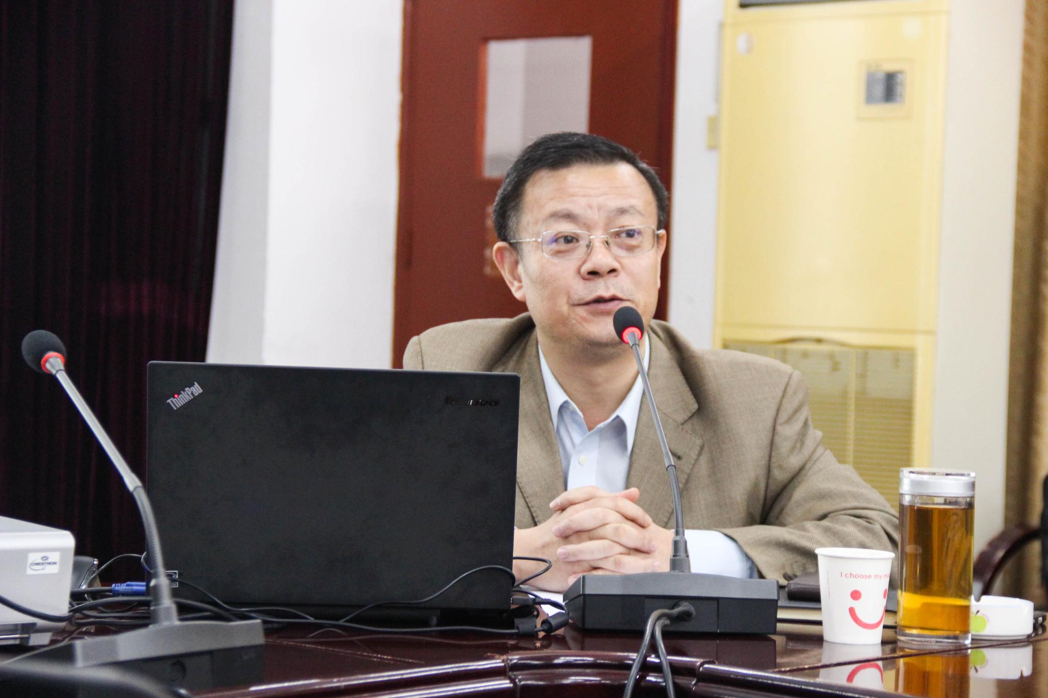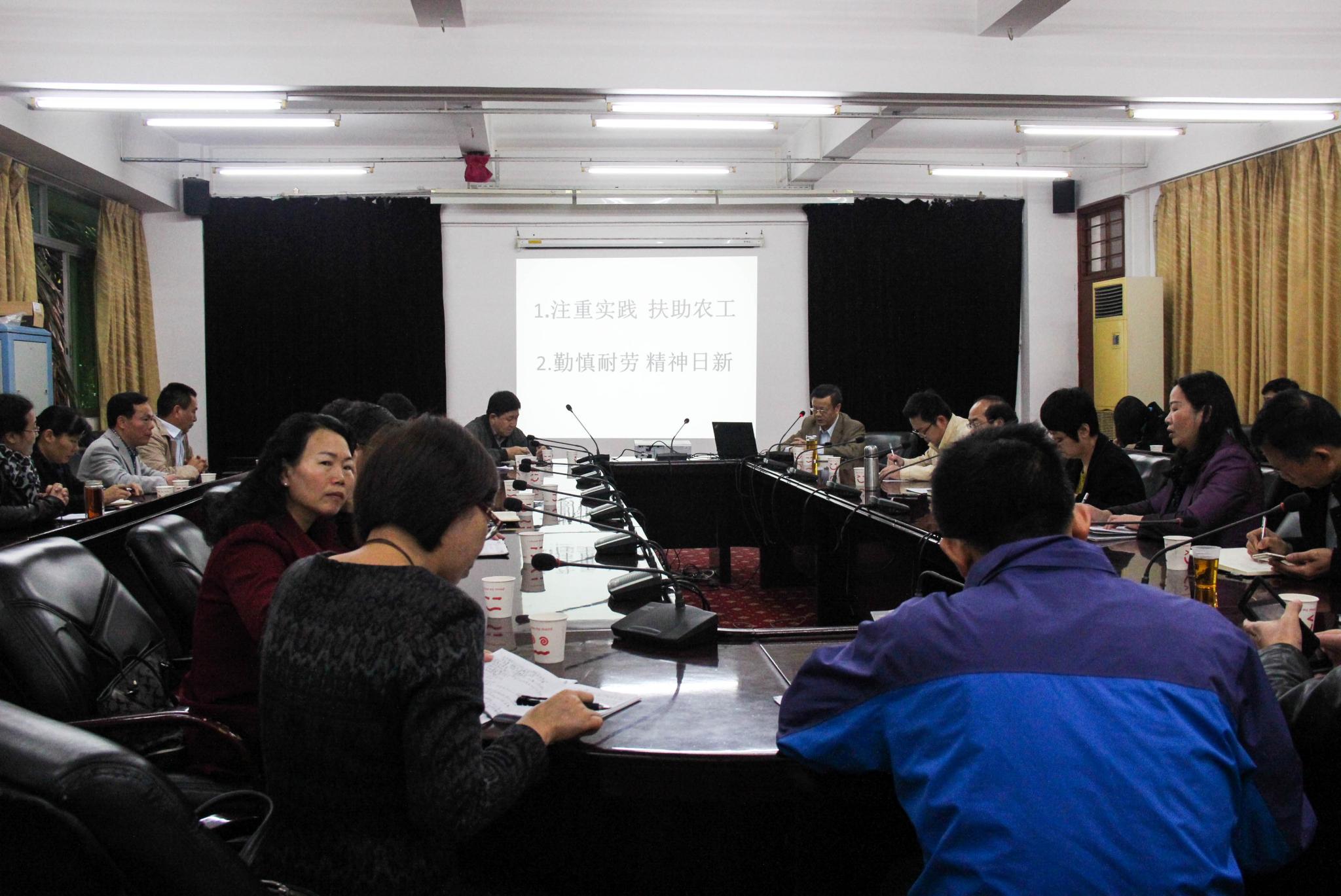 唐明勇做校训前期工作汇报。他介绍,经过前期校内外广泛的征集、研讨、评选和意见征求,基于我校特殊性及全国各高校校训模式,我校校训集中梳理为两个方案:一是具有丰富时代内涵的“注重实践,扶助农工”;二是结合廖何思想的“勤慎耐劳,精神日新”。