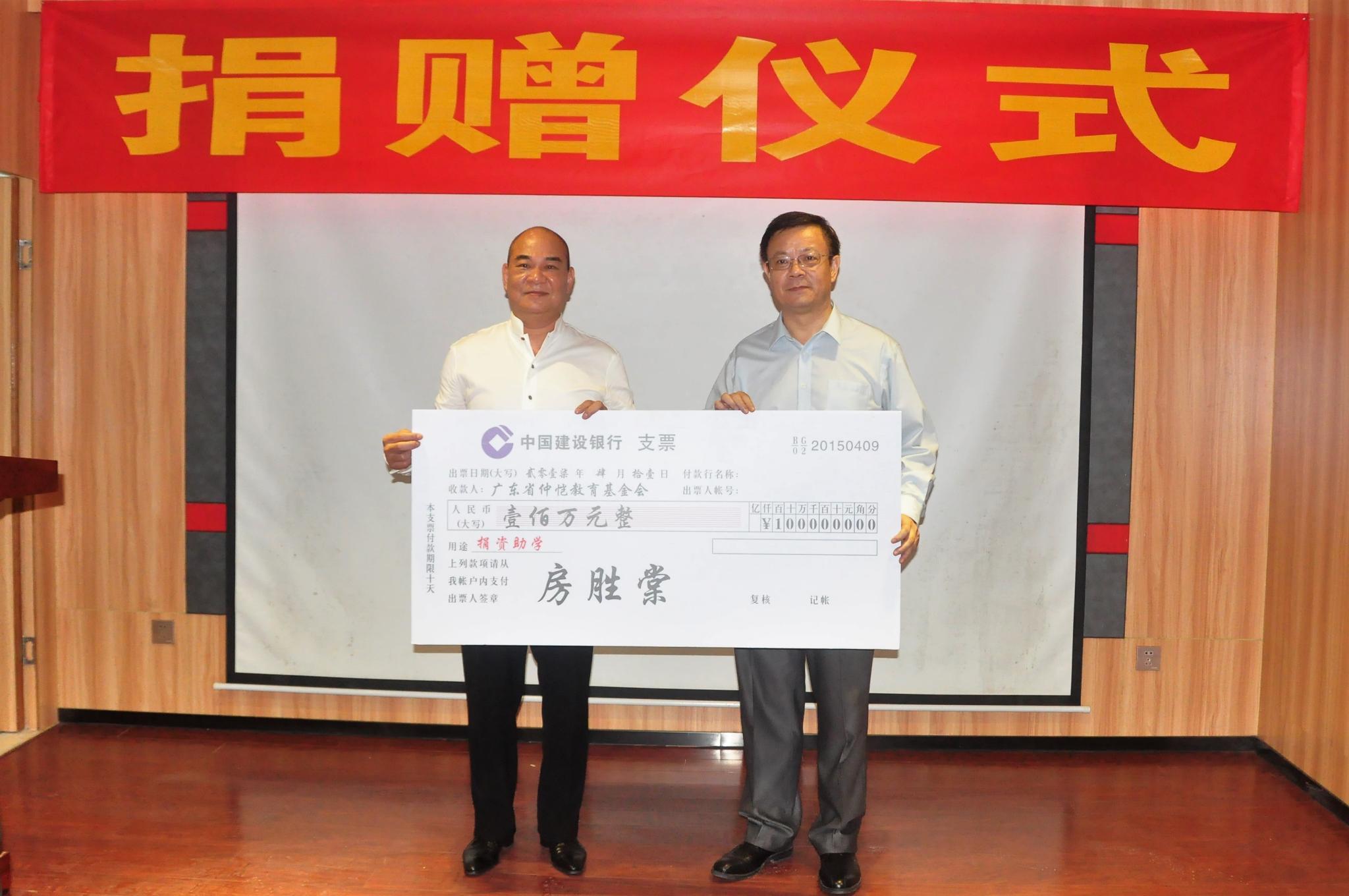 4月11日下午,在学校90周年校庆来临之际,广东省非物质文化遗产蔡李佛北胜拳的代表性传承人、澳门新恒星集团投资有限公司董事长房胜棠向我校捐赠100万元仪式在海珠校区英东楼111会议室举行。房胜棠董事长、学校党委书记宋垚臻、校长骆少明,党委副书记何斌,副校长瞿志印、朱立学,仲恺教育基金会理事长高岳仑等出席,学校相关职能部门负责人和各二级学院党总支书记参加了捐赠仪式。朱立学主持捐赠仪式。