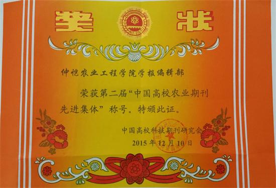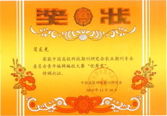 此外,在今年早些时候举行的“中国高校科技期刊研究会农业期刊专业委员会2015年学术年会暨编校大赛”上,学报编辑部简友光同志荣获“中国高校科技期刊研究会农业期刊专业委员会青年编辑编校大赛”优秀奖。