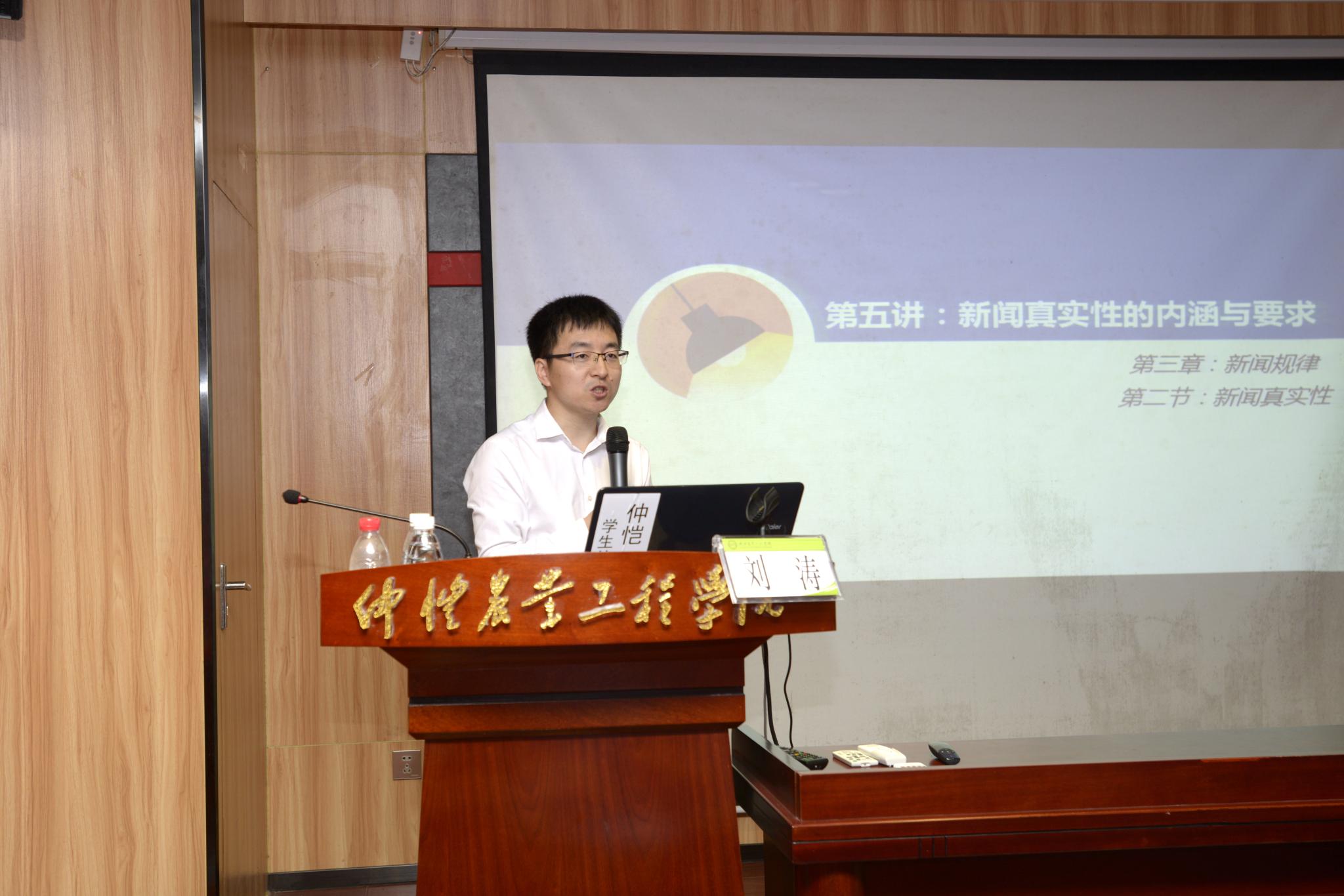 首先刘涛教授以《新闻真实性的内涵与要求》为题给大家上了一堂生动、具体、有指导意义的教学示范课。他以案例导入,向大家讲授新闻真实性的基本含义,以讲故事的方式演示新闻采访的真实性要求,最后留下“怎样把握新闻设计的‘度’”的思考题结束了示范课。