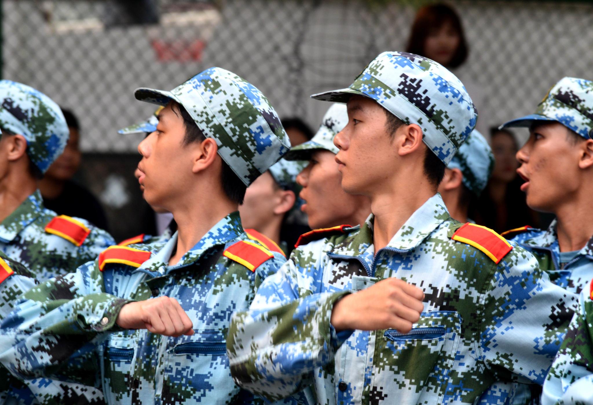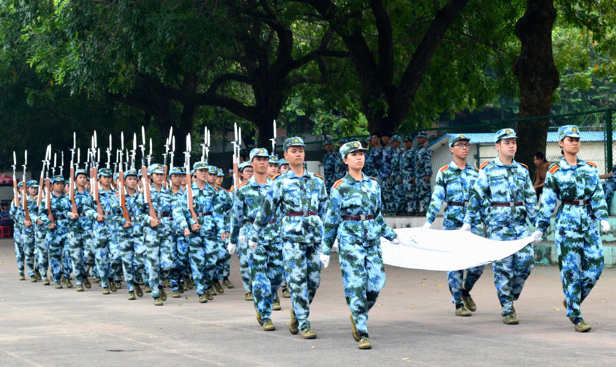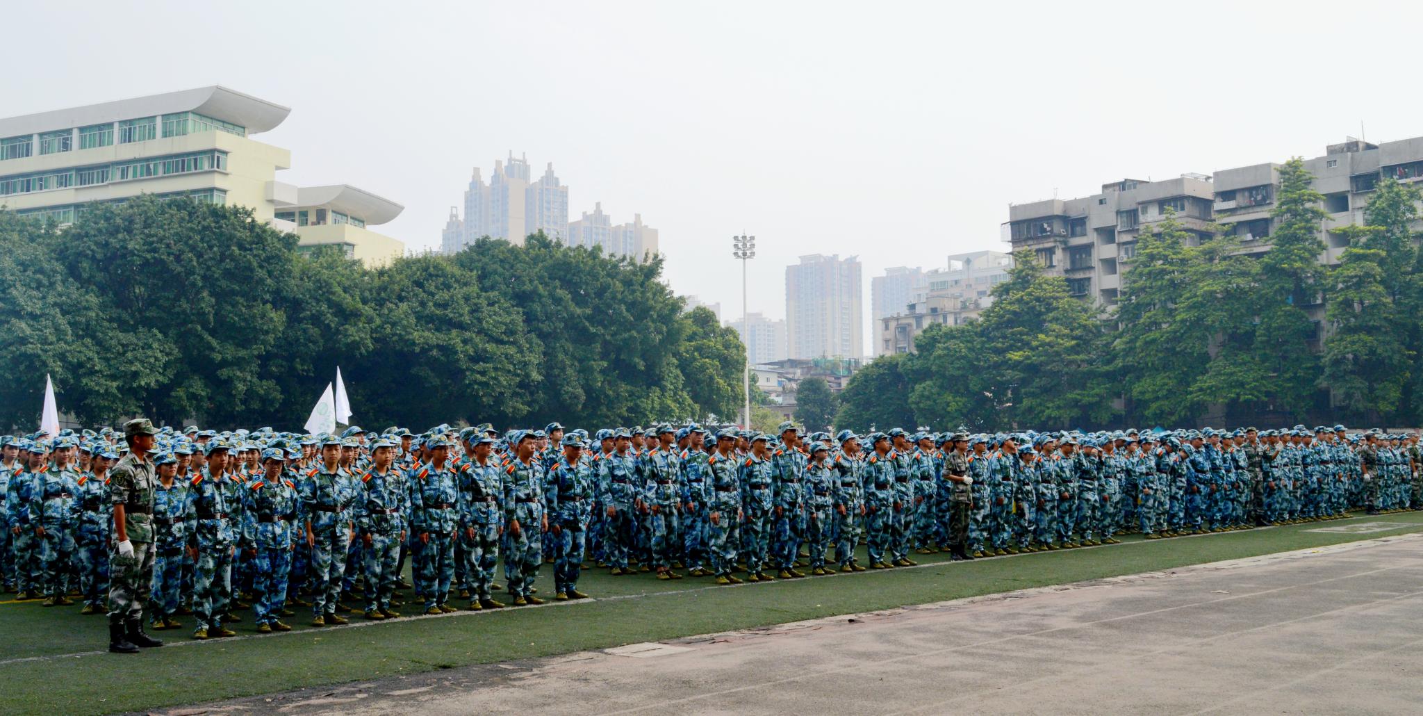 海珠校区全体参训新生汇报了开训以来的训练成果,汇报内容包括分列式进场表演,战术、军体拳、刺杀操、匕首操、格斗等特色方阵演示以及军歌、校园歌曲大合唱、摆字表演。学校保卫处组织安保人员进行了防暴训练及消防演示。