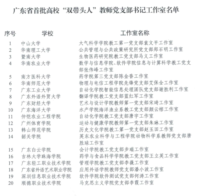 为贯彻落实省委《广东省加强党的基层组织建设三年行动计划(2018-2020年)》和省委教育工委《全省高校贯彻落实<广东省加强党的基层组织建设三年行动计划(2018-2020年)>实施方案》,省委教育工委在全省高校开展了首批高校“双带头人”教师党支部书记工作室评选工作。在各高校党委初评和推荐的基础上,省委教育工委组织复评,共遴选产生20个首批广东省高校“双带头人”教师党支部书记工作室。
