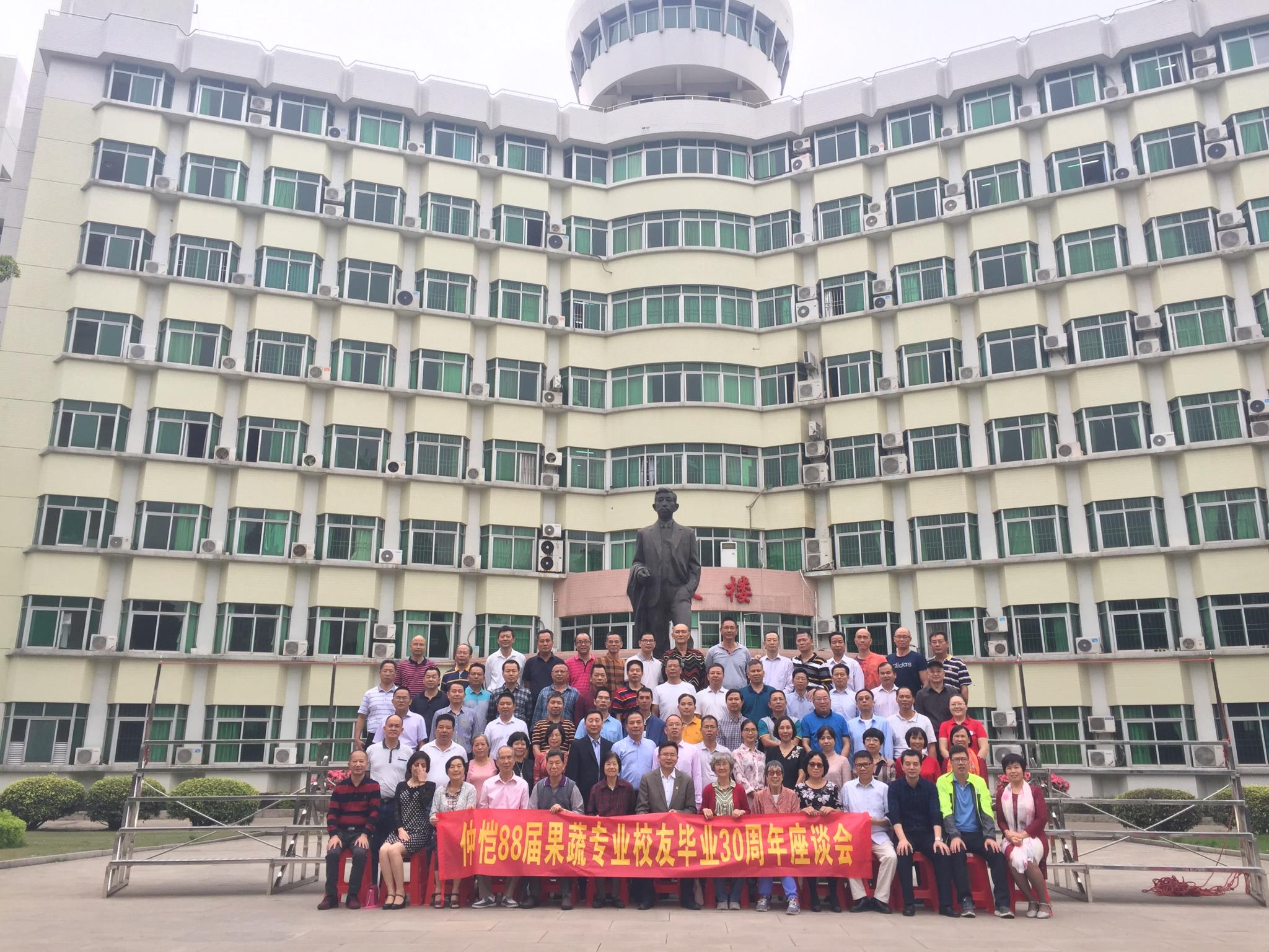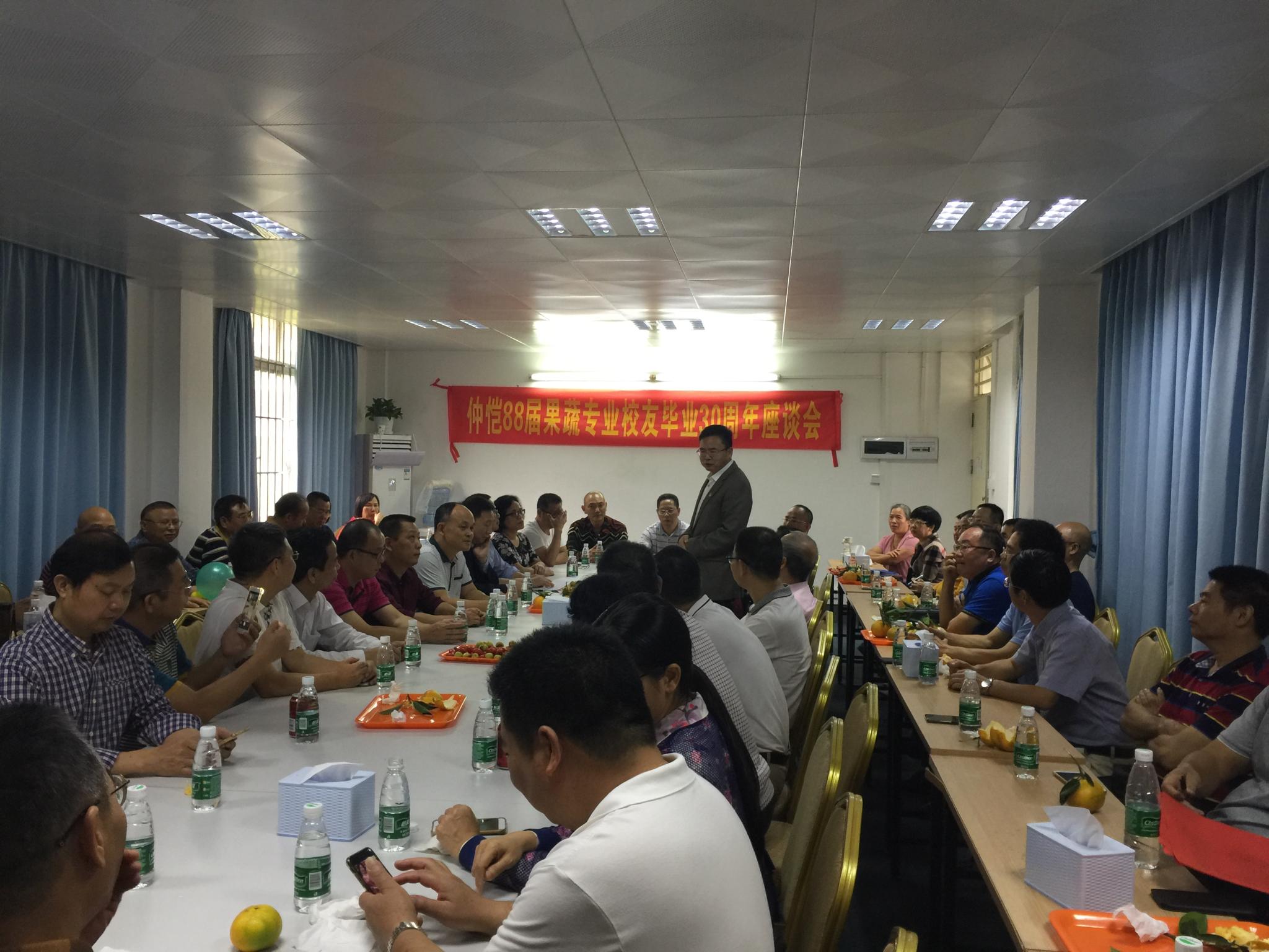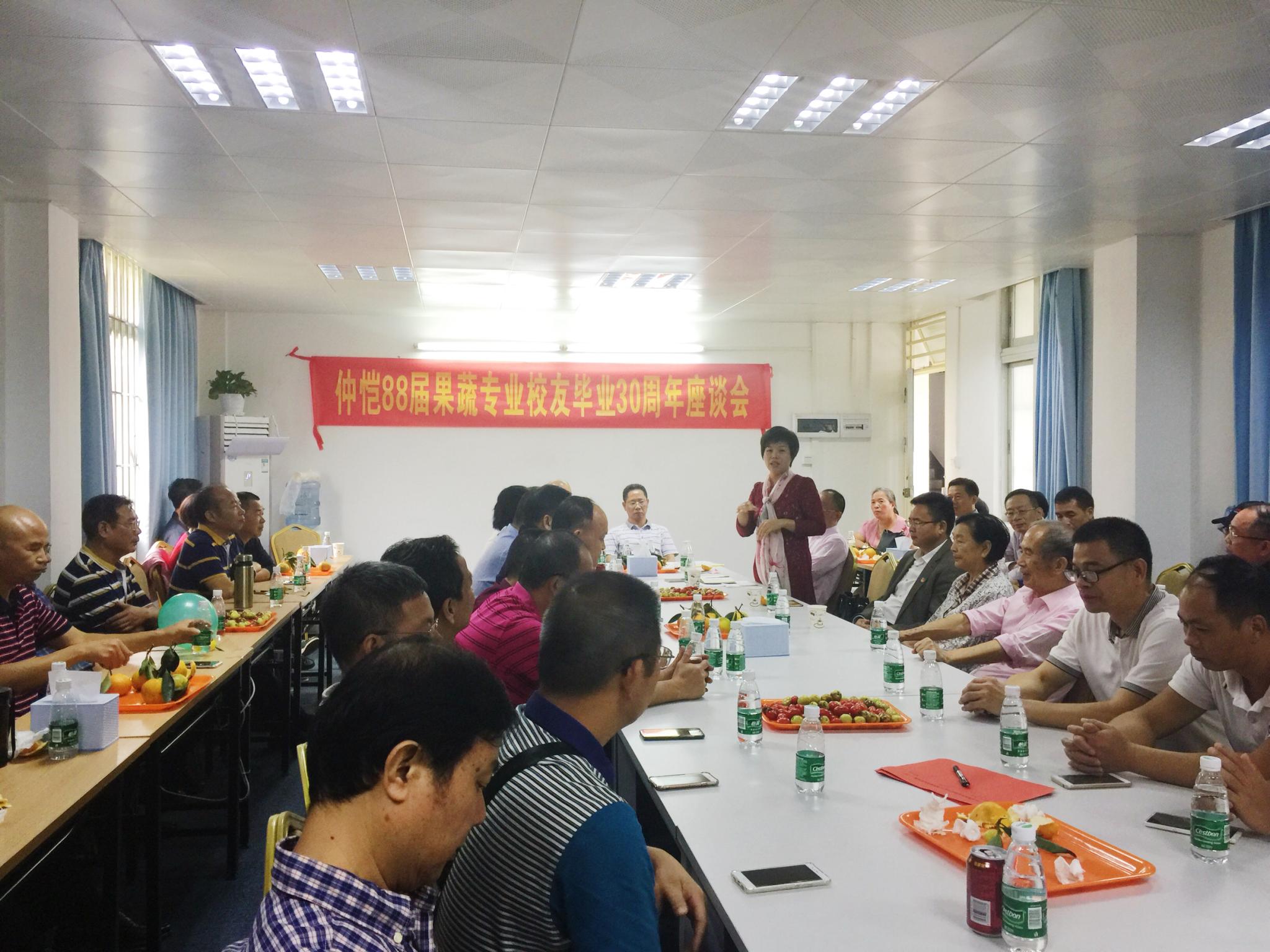 10月20日上午,我校果蔬专业1988届校友毕业30周年座谈会在海珠校区30栋303会议室举行。学校党委书记宋垚臻、园艺园林学院党总支书记陈晓玲、班主任邹志云老师、陈瑞芬老师、专业老师郑慧明老师和58位校友参加了此次座谈,会议由李宇高(1988届校友,原学生会主席)主持。
