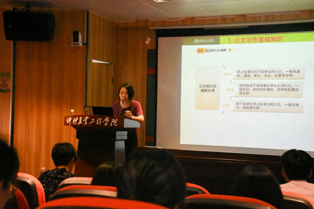 5月15日上午,学校第一期科级干部培训第五讲在海珠校区英东楼111会议室举行,本期的主题是“提高公文写作能力”,由学校党政办副主任姜晓丽主讲。讲座由党委组织部部长黄碧珠主持。