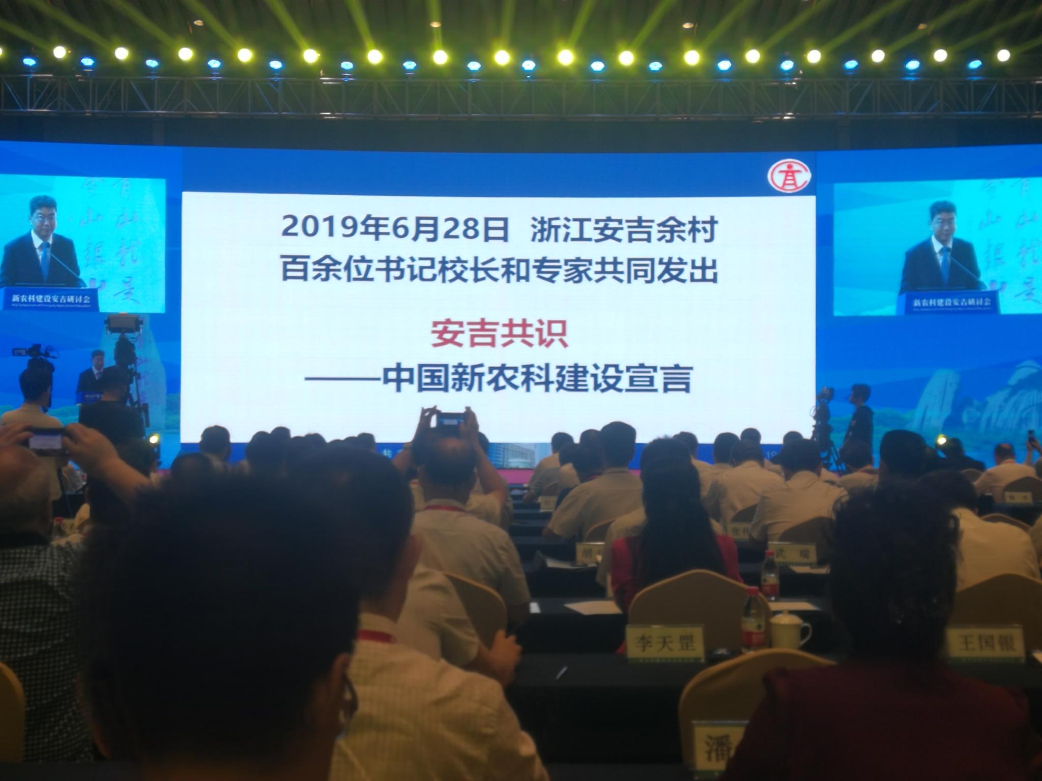 6月28日,由教育部主办的新农科建设安吉研讨会在浙江省安吉县余村召开。来自全国50余所涉农高校的140余位党委书记、校长和知名专家齐聚一堂,围绕总书记关于“两山”理念的重要论述和新时代中国高等农林教育创新发展的思路和举措进行了交流与研讨。我校校长程萍和教务处处长石玉强出席大会,共襄盛举。会议发布了《安吉共识——中国新农科建设宣言》,对新农科建设做出了总体部署。