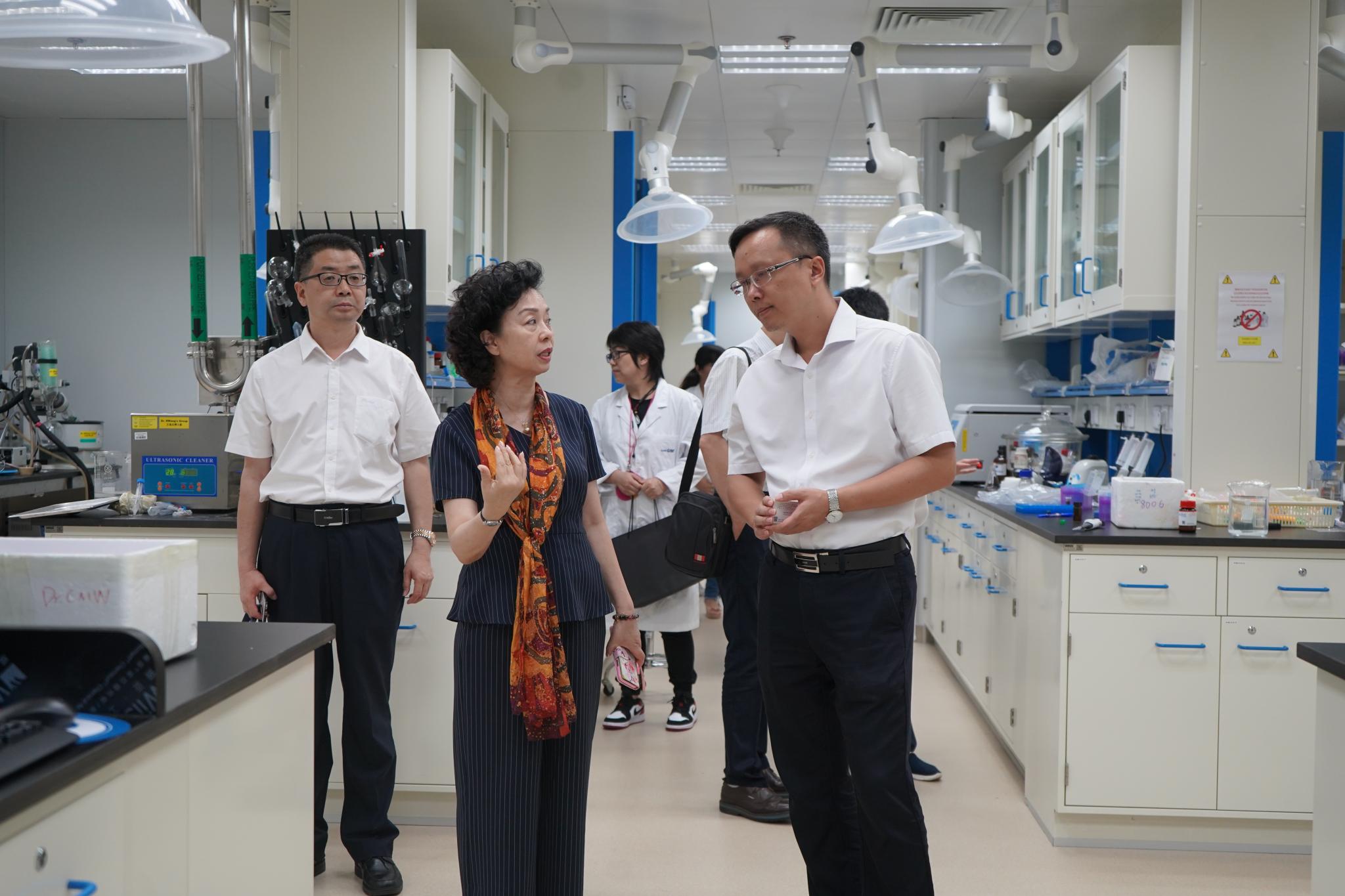 7月25日下午,程萍校长与澳门大学副校长葛伟博士就校际合作达成意向,并参观澳门大学中药质量研究国家重点实验室,与中医药研究院副院长李鹏、重点实验室萧建波博士深入洽谈科研合作,达成战略合作共识。