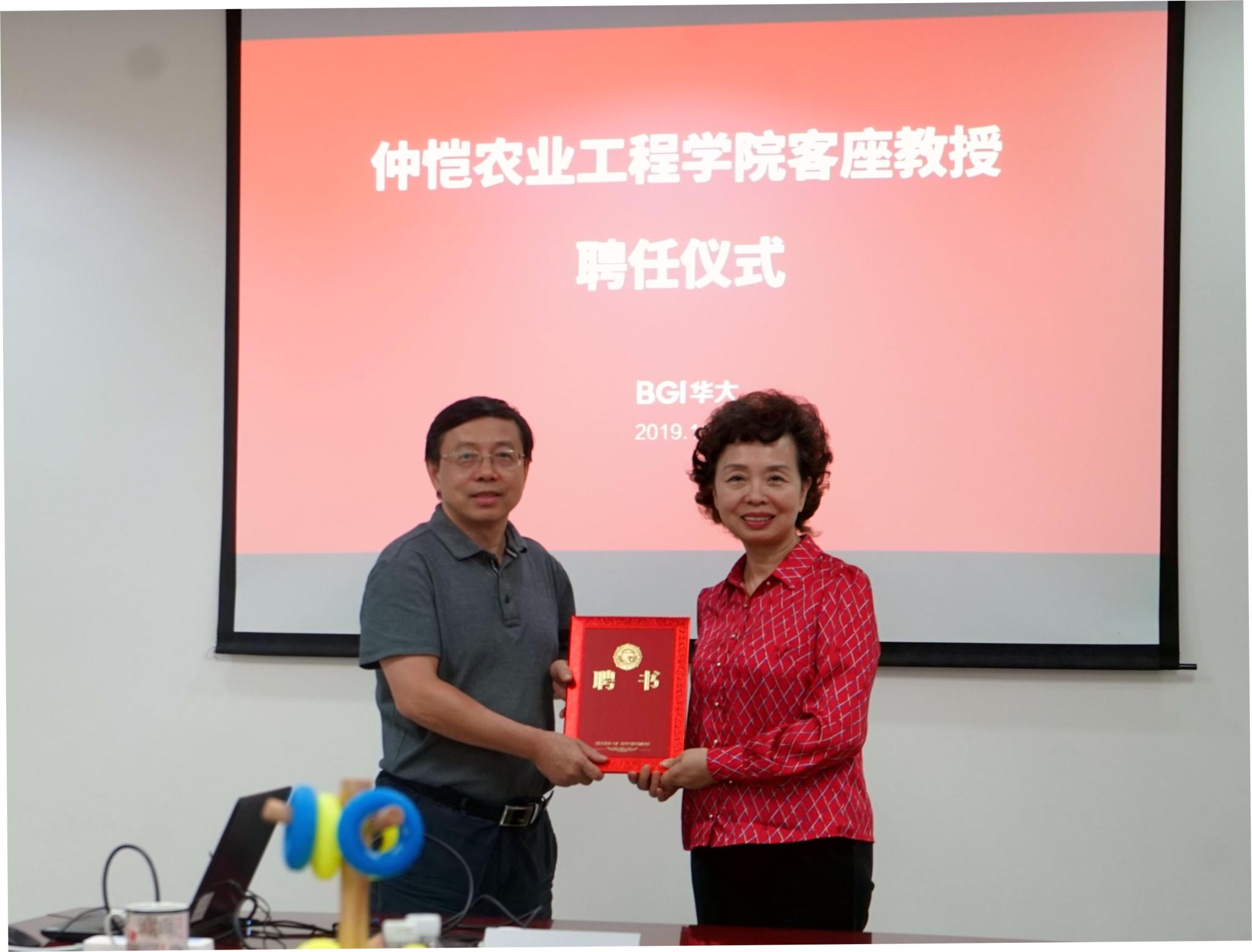 近日,程萍校长带队到华大基因就仲华基因科技产业学院建设实施方案进行了深入洽谈,达成一致意见。仲华基因科技产业学院将紧密融合华大基因和仲恺农业工程学院的优势资源,共同改革人才培养模式与教学体系,在课程体系、培养方案、培养过程、质量评价和教学团队等教育教学的全方位、全过程建立校企信息、人才、技术、物质资源共享和参与机制。当日,举行了现场聘任仪式,聘任华大基因8位高级职称高管人员为学校客座教授。近期,仲华基因科技产业学院将在我校选招学生,开设首期“仲华基因科技产业班”。