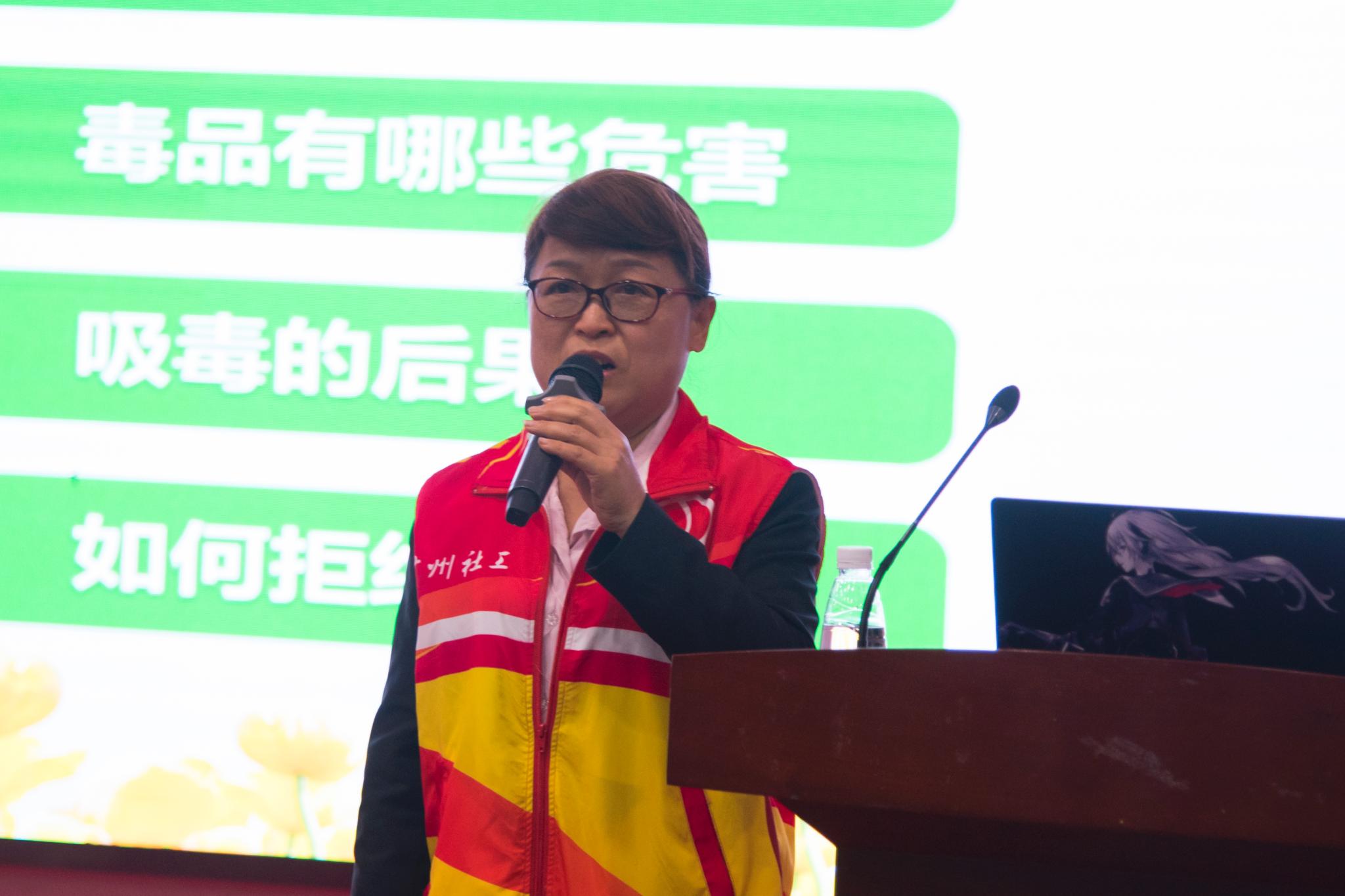 第一部分是禁毒知识宣讲。滨江街心明爱社工站副总干事曹丽影用幽默的话语,生动的案例给大家讲解了毒品的种类、吸毒的危害及如果拒绝毒品等内容,进一步提高同学们识毒、辨毒、拒毒的能力,给同学们上了一堂生动的禁毒课。