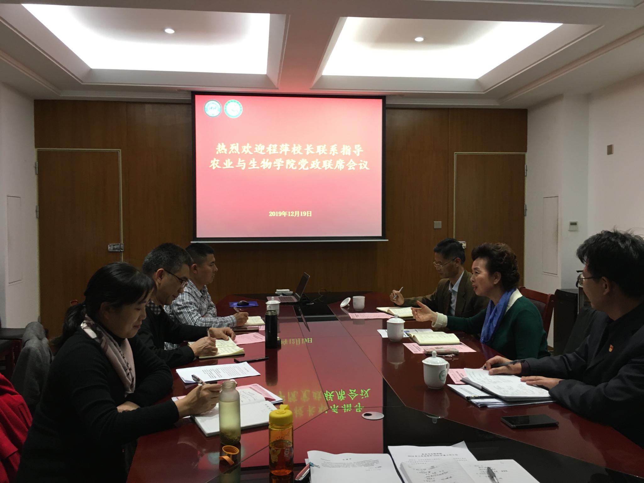 程萍校长表示,非常高兴参加农业与生物学院党政联席会议,对该院2019年各项工作的开展情况进行全面了解。她对学院领导班子的工作给予肯定,认为班子团结一心、共同谋划、分工明确,各位副职认真履职,工作有特色、有成效。