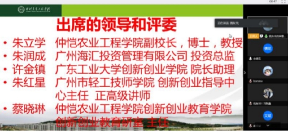 本次大赛的四位评委分别是广州海汇投资管理有限公司投资总监朱润成、广东工业大学创新创业学院院长助理许金镇、广州市轻工技师学院创新创业指导中心主任朱红星和学校创新创业教育学院创新创业教研室主任蔡晓琳。参赛同学、指导老师、校内创新创业导师、校外创新创业导师、校友以及省内外企业家共100余人在线围观了本次路演活动。