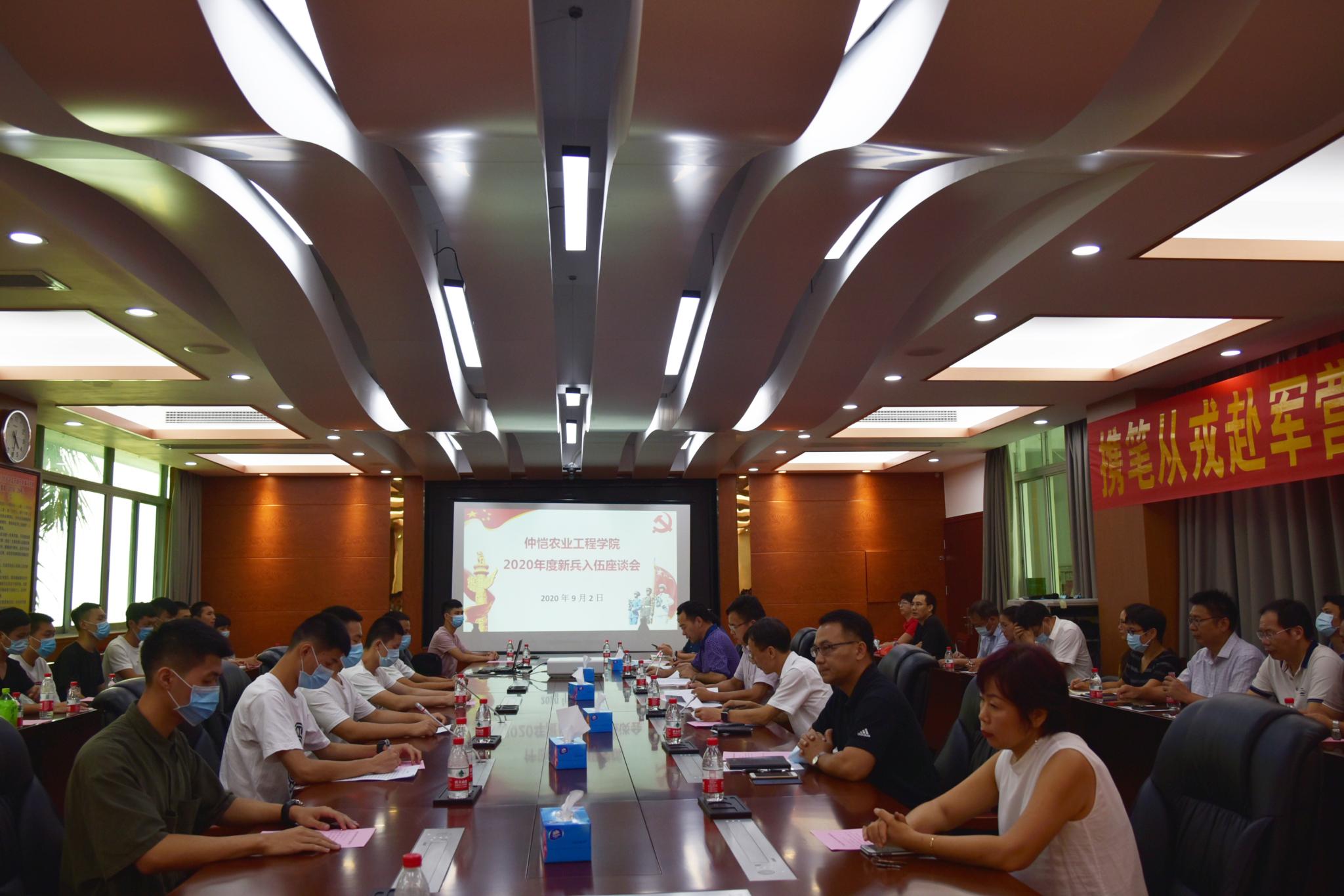 9月2日下午,我校2020年度新兵入伍座谈会在海珠校区教学楼409会议室举行。学校党委书记宋垚臻出席会议并讲话,学校征兵工作领导小组成员,各二级学院分管学生工作的党总支书记、副书记和2020年入伍新兵参加座谈会。会议由学生工作部(处)、武装部部长李伟东主持。