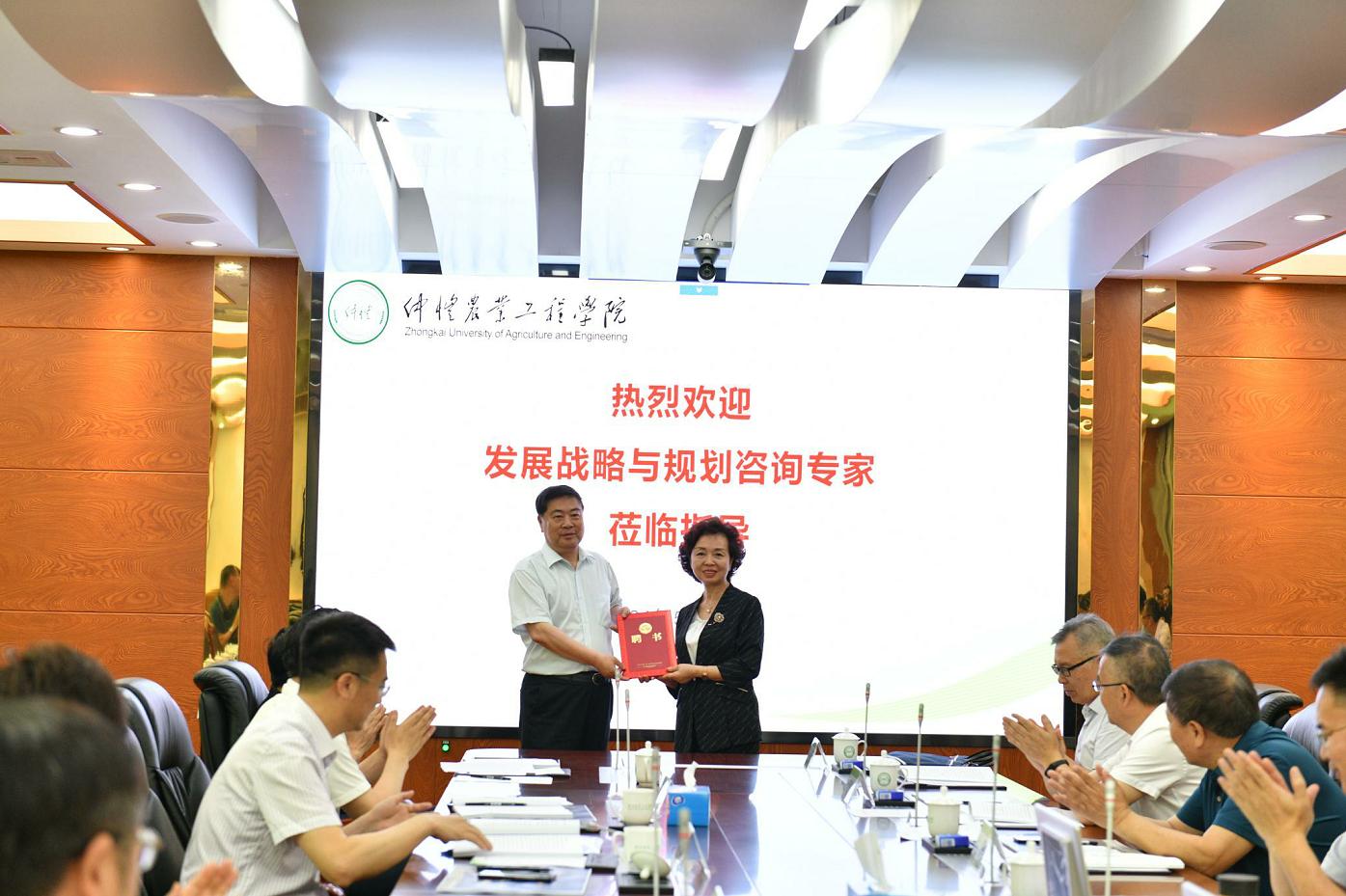 程萍为出席会议的学校发展战略与规划咨询专家颁发特聘教授聘书。中国农业大学原党委书记、中国高等教育学会第六届理事会会长瞿振元教授获推选为咨询专家组组长。