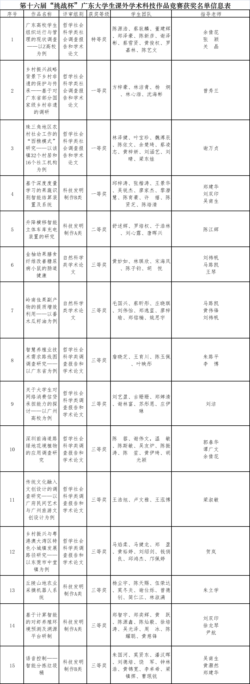 我校共15件学生学术科技作品入围“挑战杯”终审决赛,其中5件作品参与了云端答辩。经过专家评审,经贸学院陈源浩等同学作品《广东高校学生组织运行与管理的现状调查——以Z高校为例》(指导老师:余倩花、张颖、关晶)荣获特等奖;人文与社会科学学院方梓豪等同学作品《乡村振兴战略背景下乡村非遗的保护与传承——基于对广东省部分国家级乡村非遗的调研》(指导老师:曾秀兰)和林泽健等同学作品《珠三角地区农村社会工作的“西樵模式”研究——以该镇32个村居和16个社工机构为例》(指导老师:谢万贞)、信息科学与技术学院邱梓涛等同学作品《基于深度度量学习的果蔬识别智能结算装置及系统》(指导老师:郑建华、刘双印、吴南生)等三个作品荣获一等奖,其他作品分别揽获二、三等奖,我校参赛总成绩再创新高。