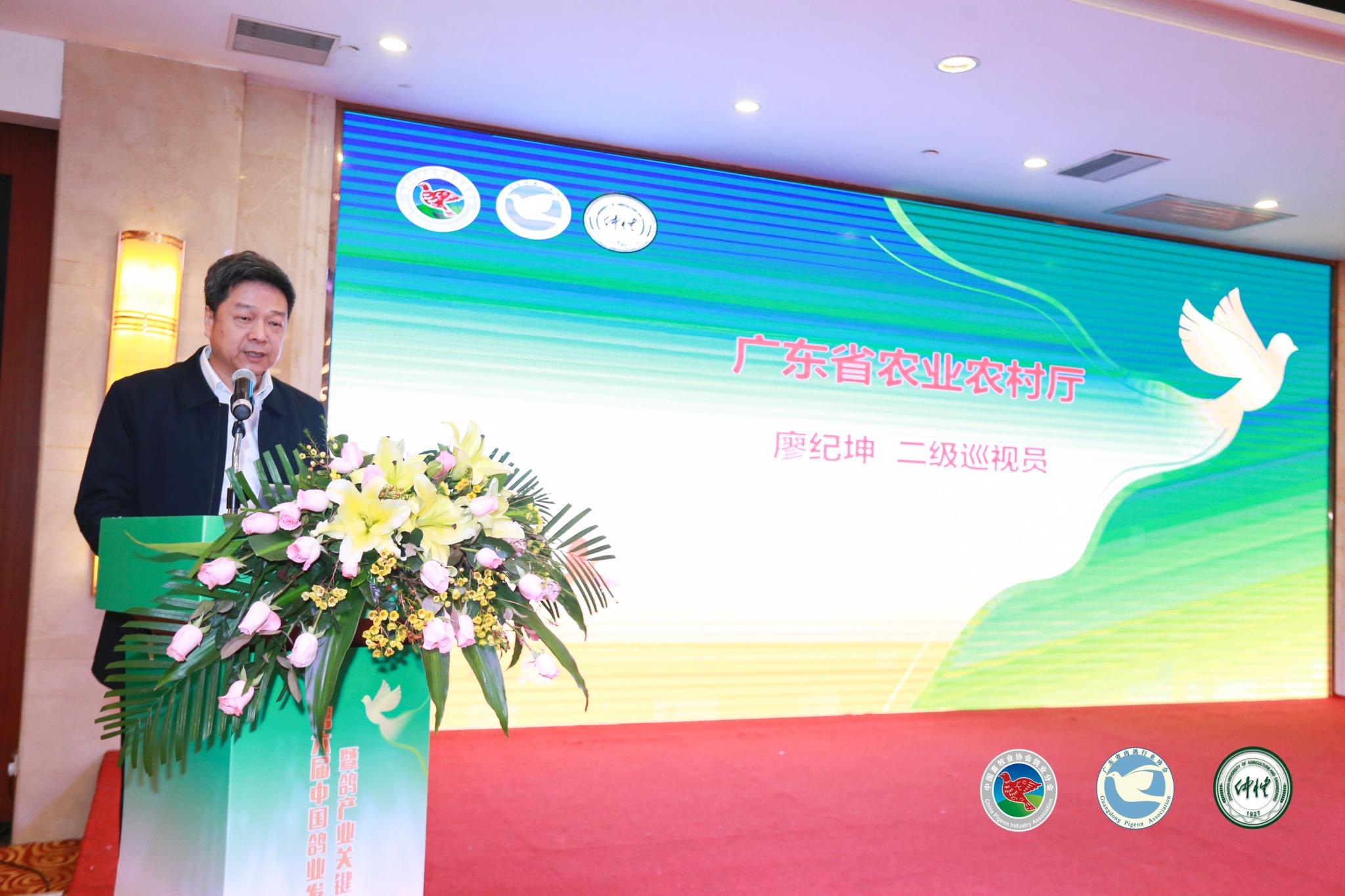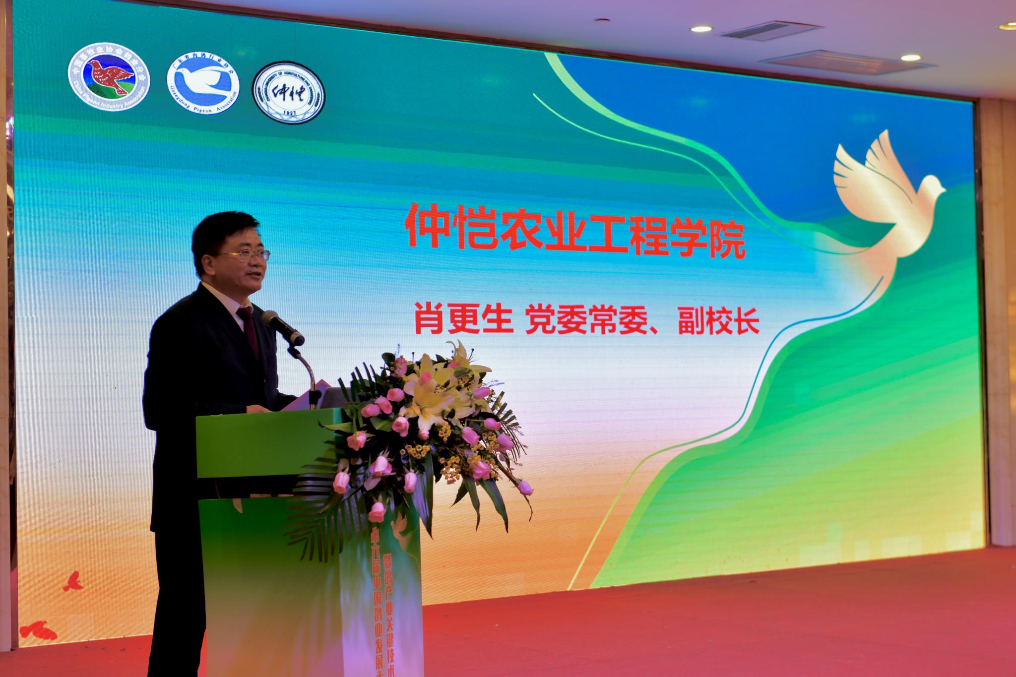 学校党委常委、副校长、乌克兰工程院外籍院士肖更生教授代表学校向大会的召开和各位领导嘉宾、专家学者的到来表示衷心祝贺和热烈欢迎。他表示,鸽产业是我省特色鲜明的地方优势产业,近年来仲恺农业工程学院充分发挥涉农高校科研、人才优势,致力于校企合作,坚持以科技赋能鸽业产业发展,组建了跨学科、多团队参与的肉鸽全产业链技术研发团队,成功打造多个优秀区域品牌,贡献了仲恺力量。他呼吁鸽产业人士共同努力,以鸽业产业促进农业经济发展,共同分享、共同学习、共同为乡村振兴战略贡献力量。