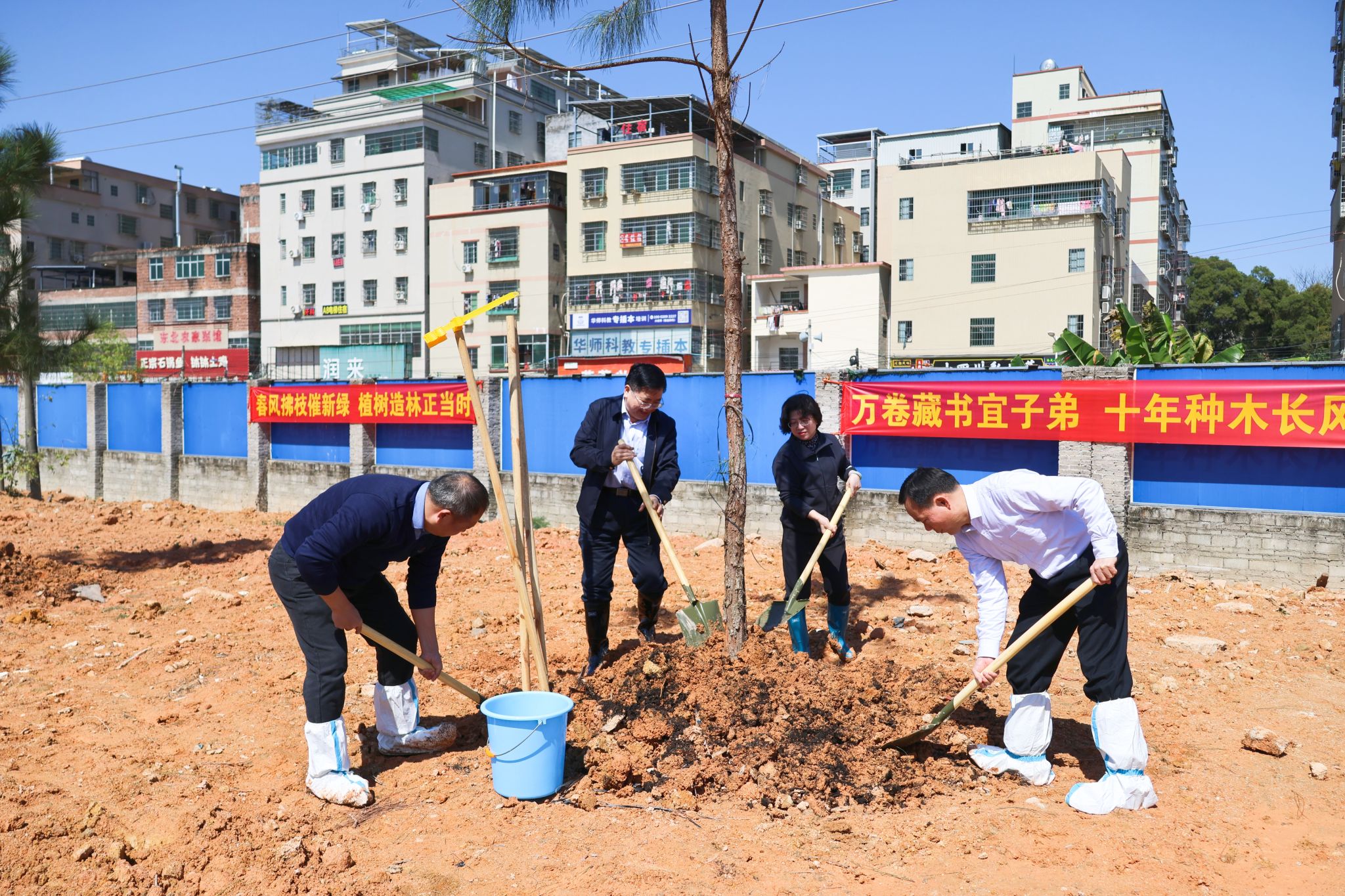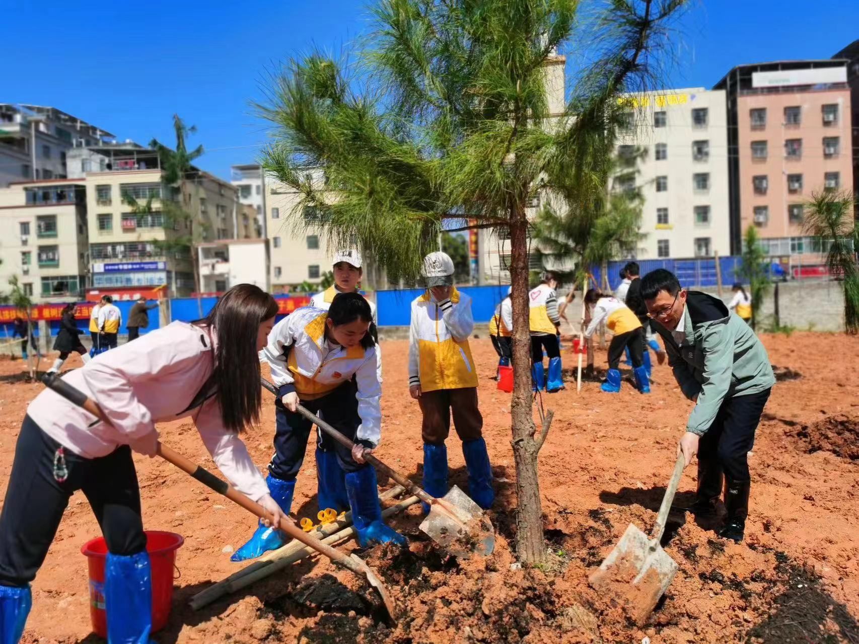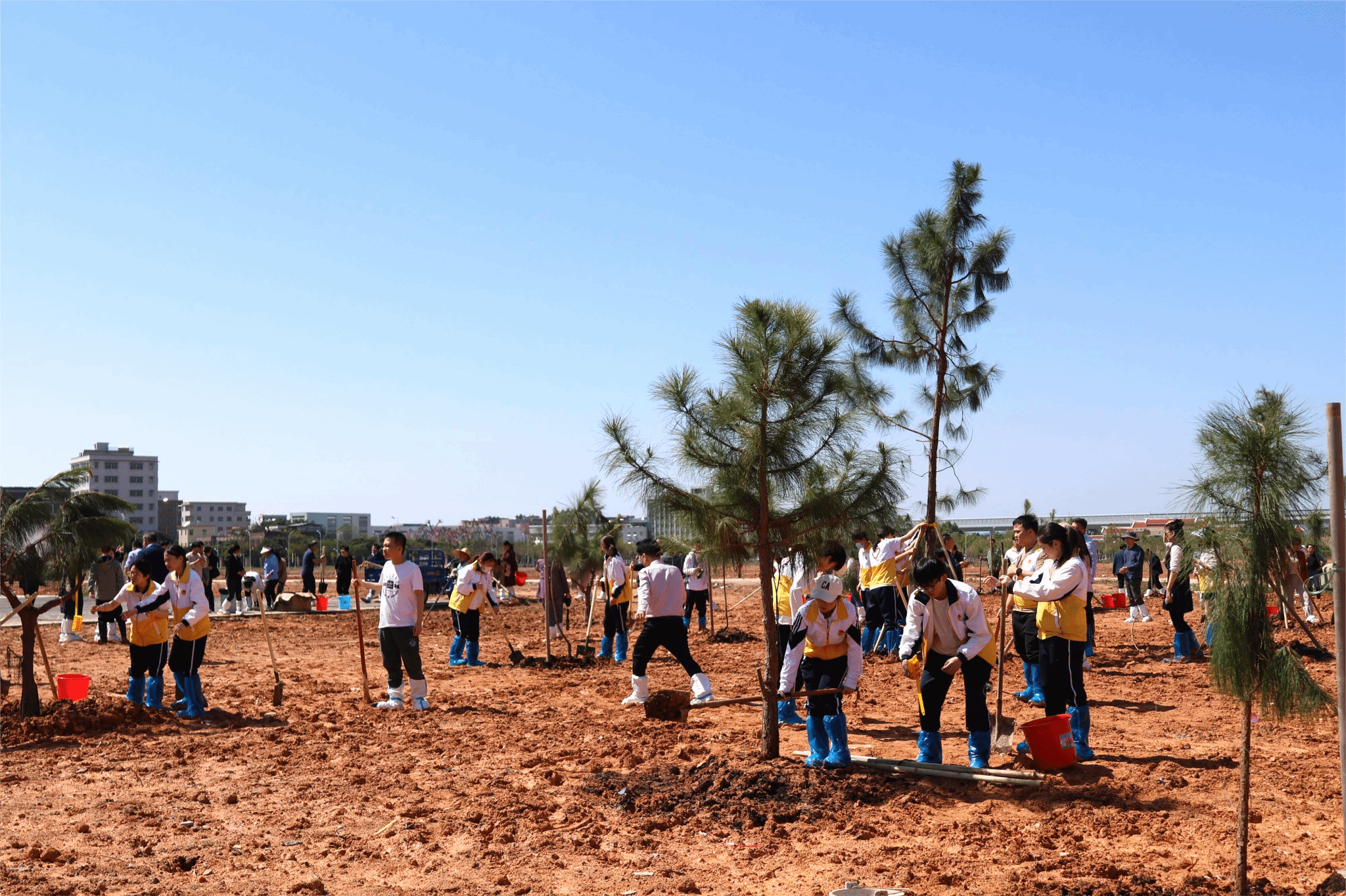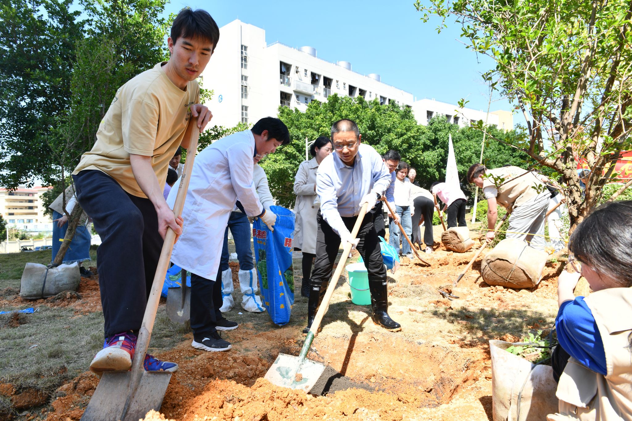 启动仪式后,校领导在白云校区图书馆东北侧空地与师生代表一道,合力种下松树。大家挥锹铲土、扶苗培土、围堰浇水,用辛勤劳动为美丽仲园再添新绿。在师生共同的努力下,新种下的松树苗迎风挺立、错落有致、焕发生机。