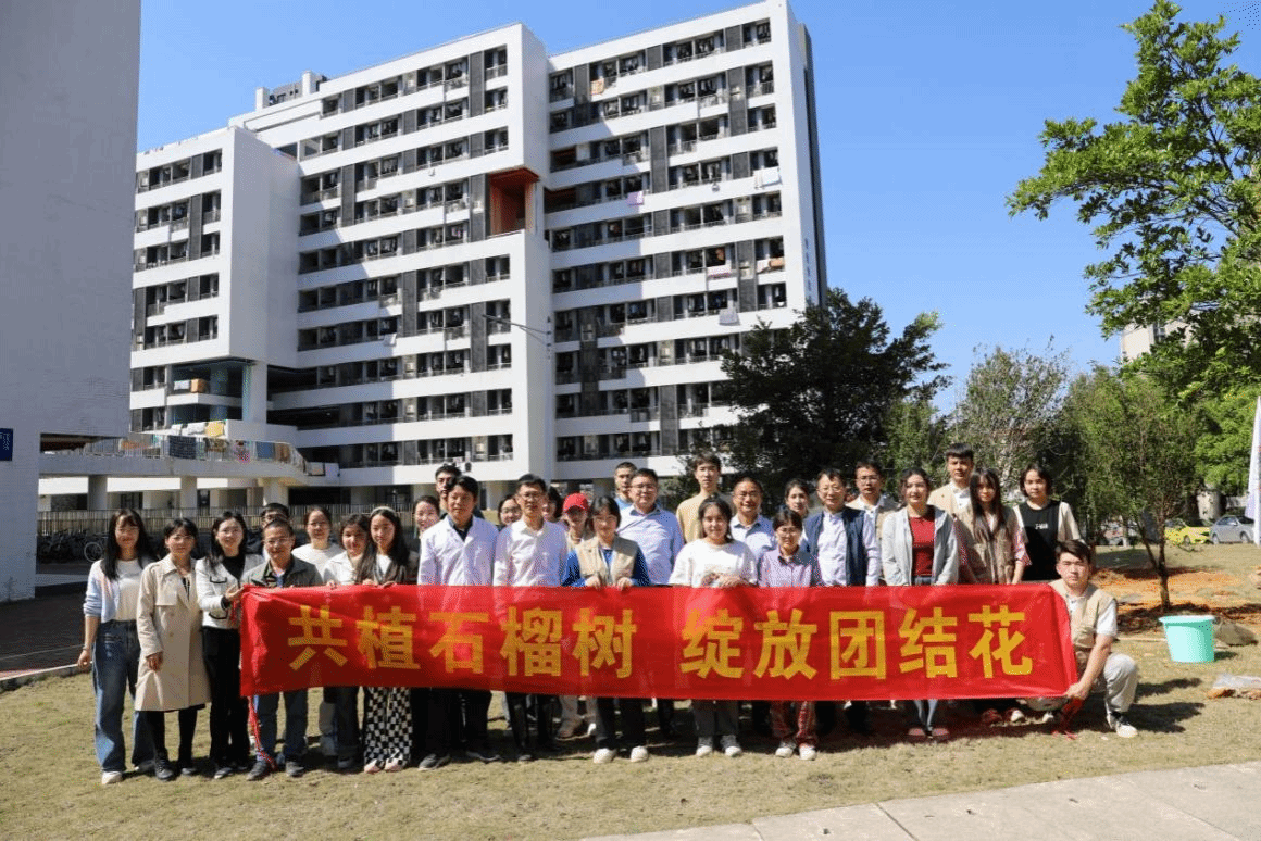 在白云校区学生宿舍20栋前草坪处,学生工作部“五十六朵花工作室”开展“共植石榴树 绽放团结花”主题植树活动。宋垚臻、廖明、朱立学等校领导与学生工作部负责人、园艺园林学院教师及18名少数民族学生代表共同种下象征民族团结、承载着深厚民族情谊的石榴树苗,打造民族团结进步“石榴籽林”特色品牌,将民族团结进步创建工作与生态文明建设、弘扬中华优秀传统文化有机结合,引导学生树立生态文明理念,争做绿色校园的守护者、民族团结的践行者,将中华民族共同体意识内化于心外化于行,让民族团结之花常开长盛。