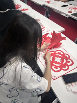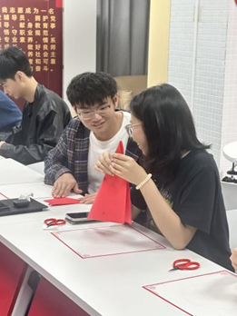 在创作过程中,同学们面临诸多挑战:折纸步骤繁琐、剪裁需反复调整,稍有不慎就会剪断线条或破坏对称。然而这些困难并未让他们却步,同学们耐心修正每次失误,互相指导技巧,直到作品成型。随着剪刀在纸面轻盈游走,最初的紧张渐渐化作专注的宁静。欢快的笑语与剪纸的沙沙声交织成韵,剪刀裁去的不仅是纸的冗余,更是日常积累的焦虑;而展开作品的瞬间,收获的不仅是非遗技艺,还有对生活之美的重新发现。