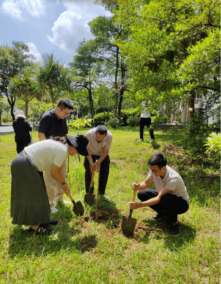 黄礼彬代表学院向校友们介绍了近年来学院在教学、科研、社会服务等方面取得的成就。谢勇老师对同学们在校时的学业、生活和文体表现等记忆犹新,对各位校友的在校事迹如数家珍。为表达对母校的培育之恩,环科111班校友自发组织捐赠了四株黄花风铃木。校友们与学院领导老师在学院楼前携手完成挖坑、培土、浇水植树活动。黄花风铃木花期长、适应性强,象征校友与母校之间深厚持久的情谊。下午,校友们驱车到达海珠校区进行座谈和茶叙。