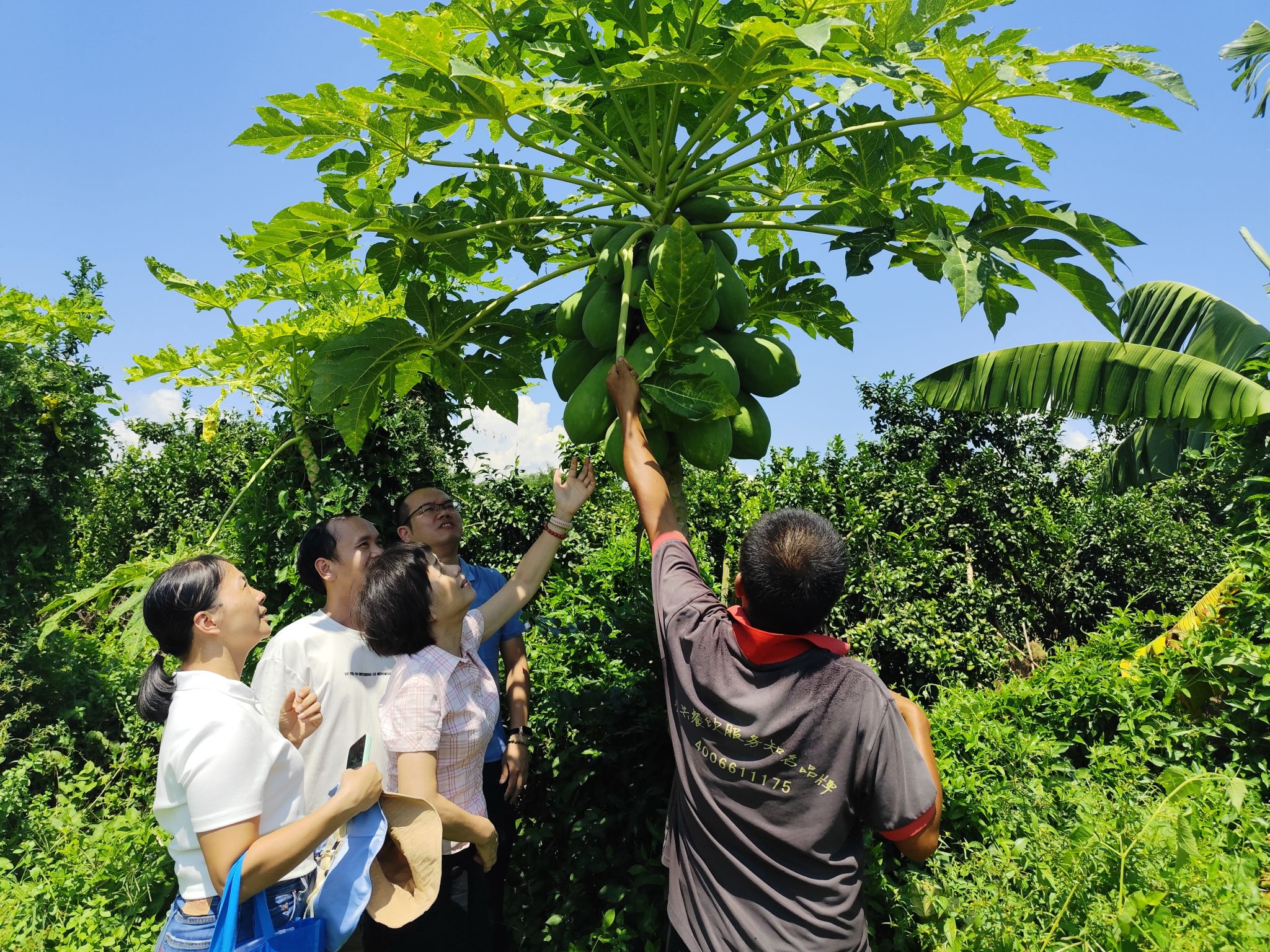 在谢屋村种养植场木瓜基地,特派员一行在种植户蔡菊艳的带领下,实地考察了解了农场木瓜的生长状态、病虫害防治、施肥用药情况和产销状况,并就接下来木瓜食品加工、乳液化妆品价值和羽衣甘蓝蔬菜品种种植等进行了深入的讨论交流。