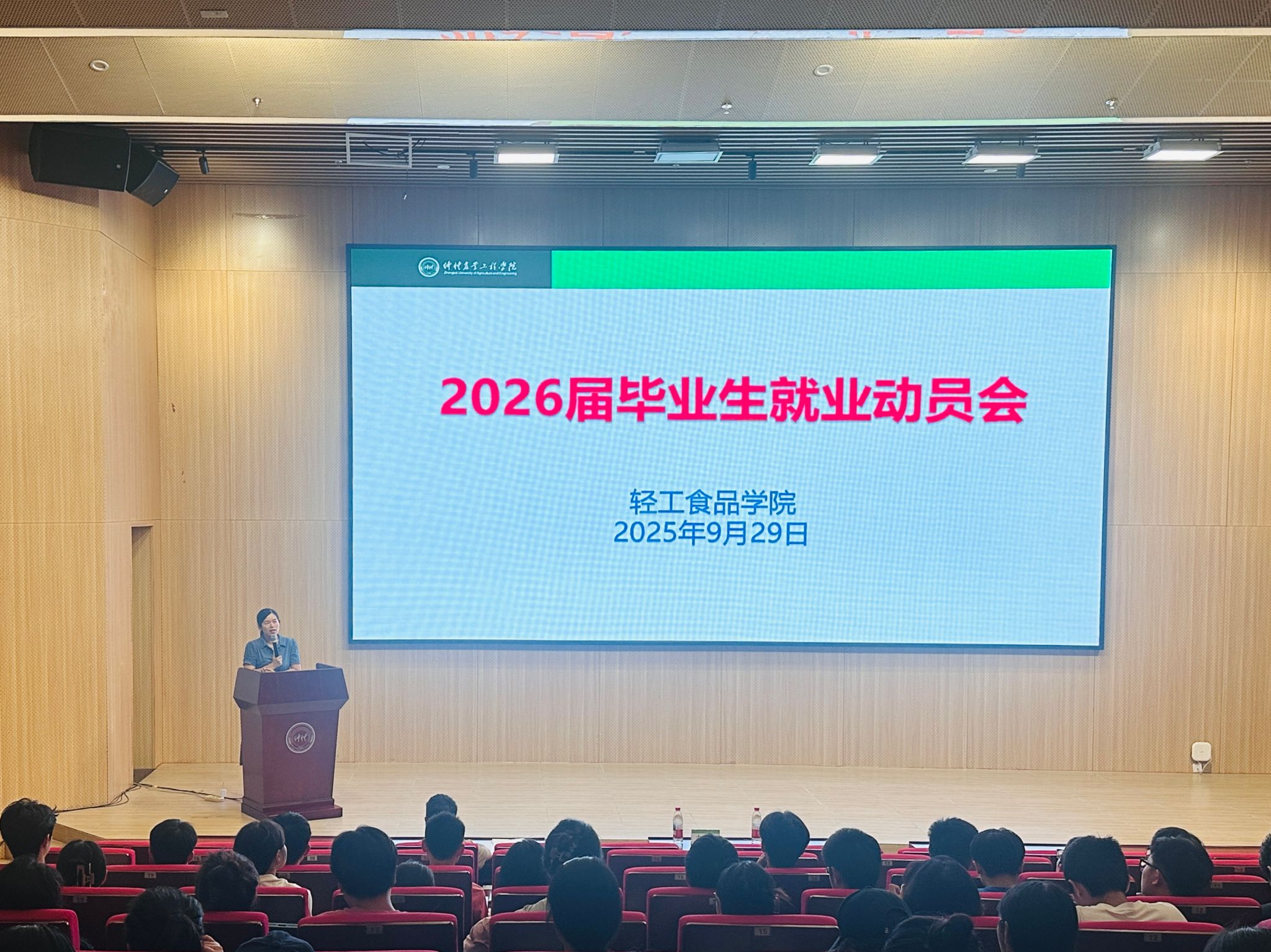 为全面贯彻落实国家关于高校毕业生就业工作的决策部署,扎实推进2026届毕业生就业工作,9月29日下午,轻工食品学院在白云校区行政楼学术报告厅召开2026届毕业生就业动员会。学校学生就业指导中心副研究员洪梅、轻工食品学院党委副书记吉燕出席会议并作指导,学院毕业班辅导员及全体在校毕业生参加。
