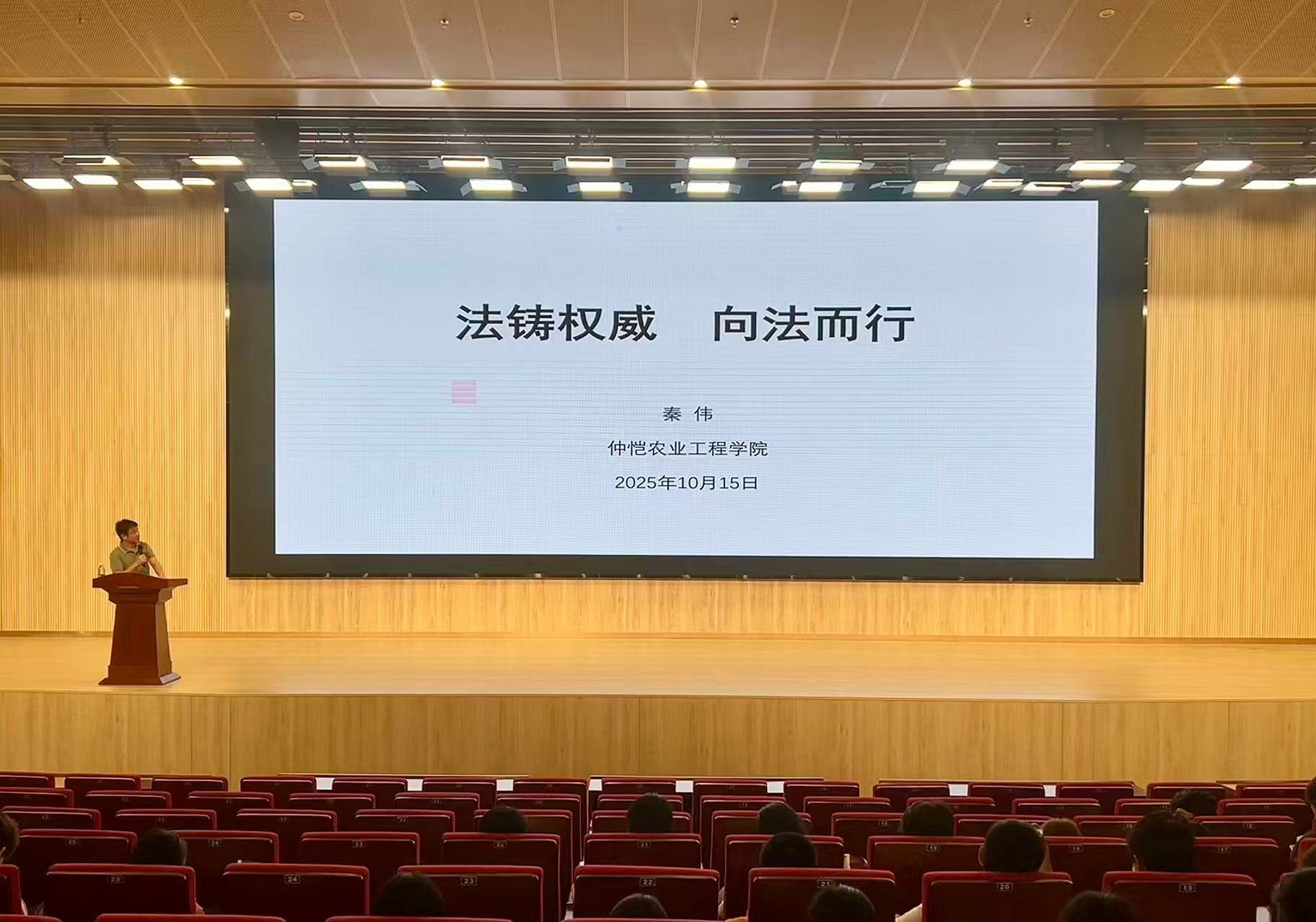 秦伟以 “法铸权威,向法而行” 为主题,从 “法律观念” 引入,打破新生对法律的距离感,随后围绕五大核心板块展开讲解:结合宿舍管理、学业规范等场景解读校园生活相关法律,通过电信诈骗、校园贷案例剖析财产安全法律知识,提前科普就业实习中的法律权益与红线,强调网络言论、信息保护等网络行为规范,最后明确校园及社会层面的法律帮助途径。整场讲座案例鲜活、贴合需求,有效填补新生法律知识盲区,引导新生以法治思维规划大学生活。