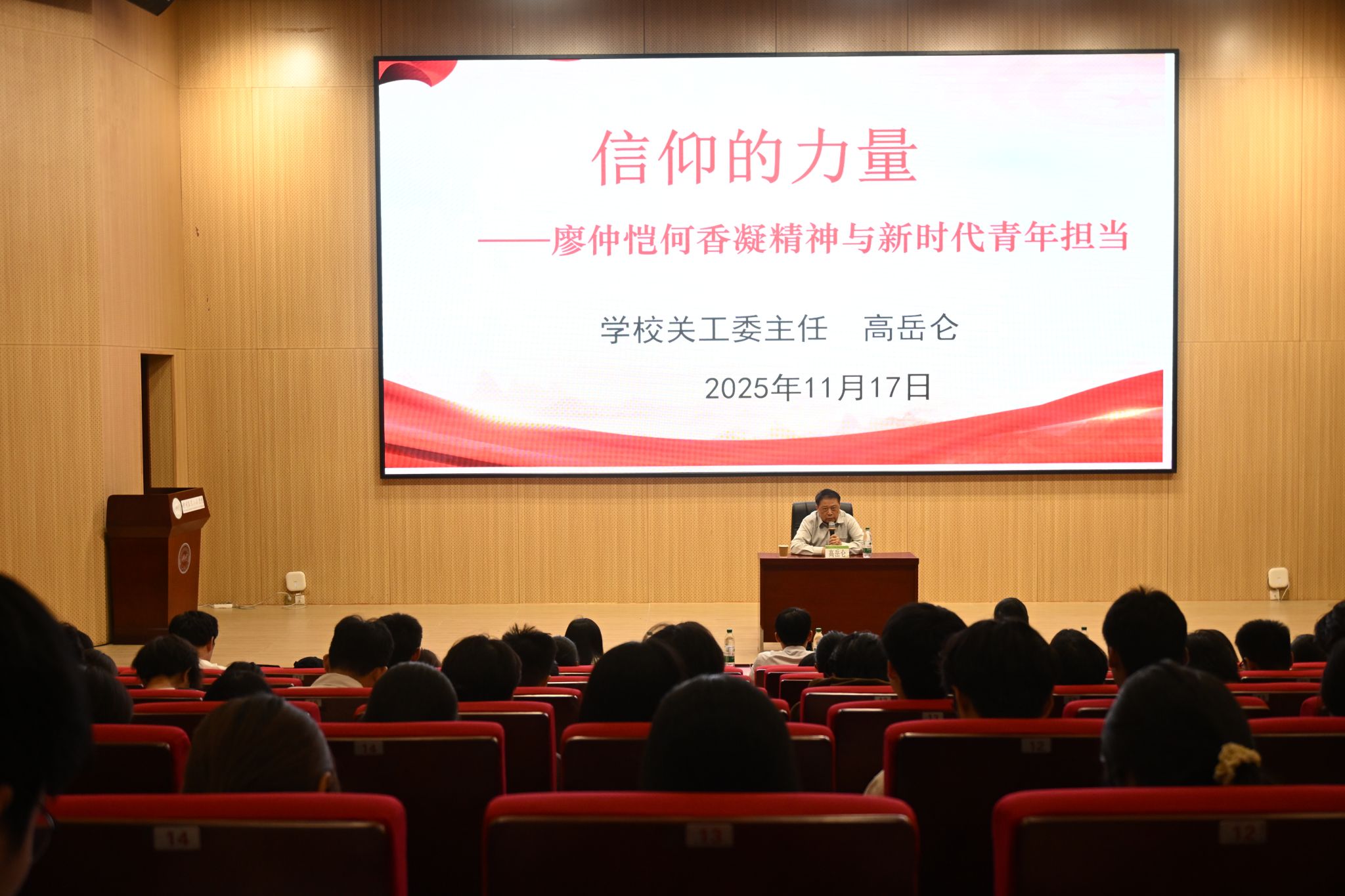 为深入学习贯彻习近平新时代中国特色社会主义思想,引导青年学生坚定理想信念、端正入党动机、担当时代使命,11月17日晚,轻工食品学院在德新楼学术报告厅举行“信仰的力量——廖仲恺何香凝精神与新时代青年担当”专题入党宣讲报告会。学校关工委主任、原党委副书记高岳仑教授应邀作主题报告。学校党委组织部副部长梁其才,轻工食品学院党委副书记吉燕、学院2025级全体新生、入党积极分子培训班学员及青马班学员共计160人共同聆听讲座。讲座由吉燕主持。
