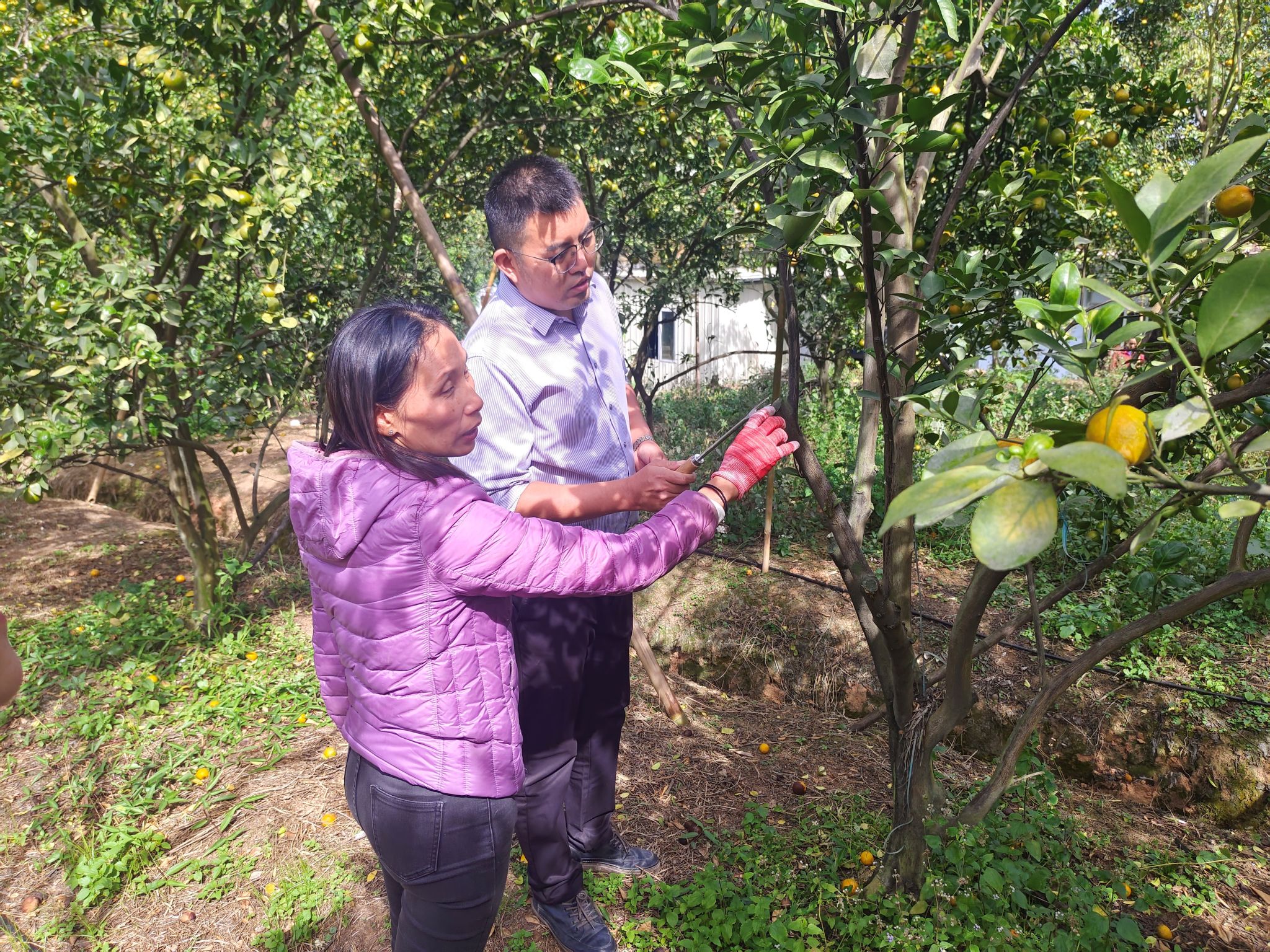 理论学习结束后,特派员团队带领参训人员前往云浮市云城区思劳镇城村贡柑种植示范基地开展现场实操教学。在贡柑种植基地,陈海斌老师现场演示了优质绿肥品种——光叶苕子的种植方法,详细讲解了播种密度、后期水肥管理等关键实操要点。直观的示范操作让抽象的技术知识具象化。操作方便的播种工具让大家耳目一新,意识到绿肥种植并不会增加过多“农活”,参训人员热情高涨,纷纷动手实践,主动向专家请教种植疑问,现场交流氛围浓厚,原本半信半疑的种植户逐渐转变为跃跃欲试的实践者。此外,特派员团队还现场采集了土壤样品,特派员专家也针对种植户提出的贡柑病虫害防治、修枝整形、流胶病防治、树皮青苔清除等种植难题,进行了一对一答疑指导,提供可行的解决方案。