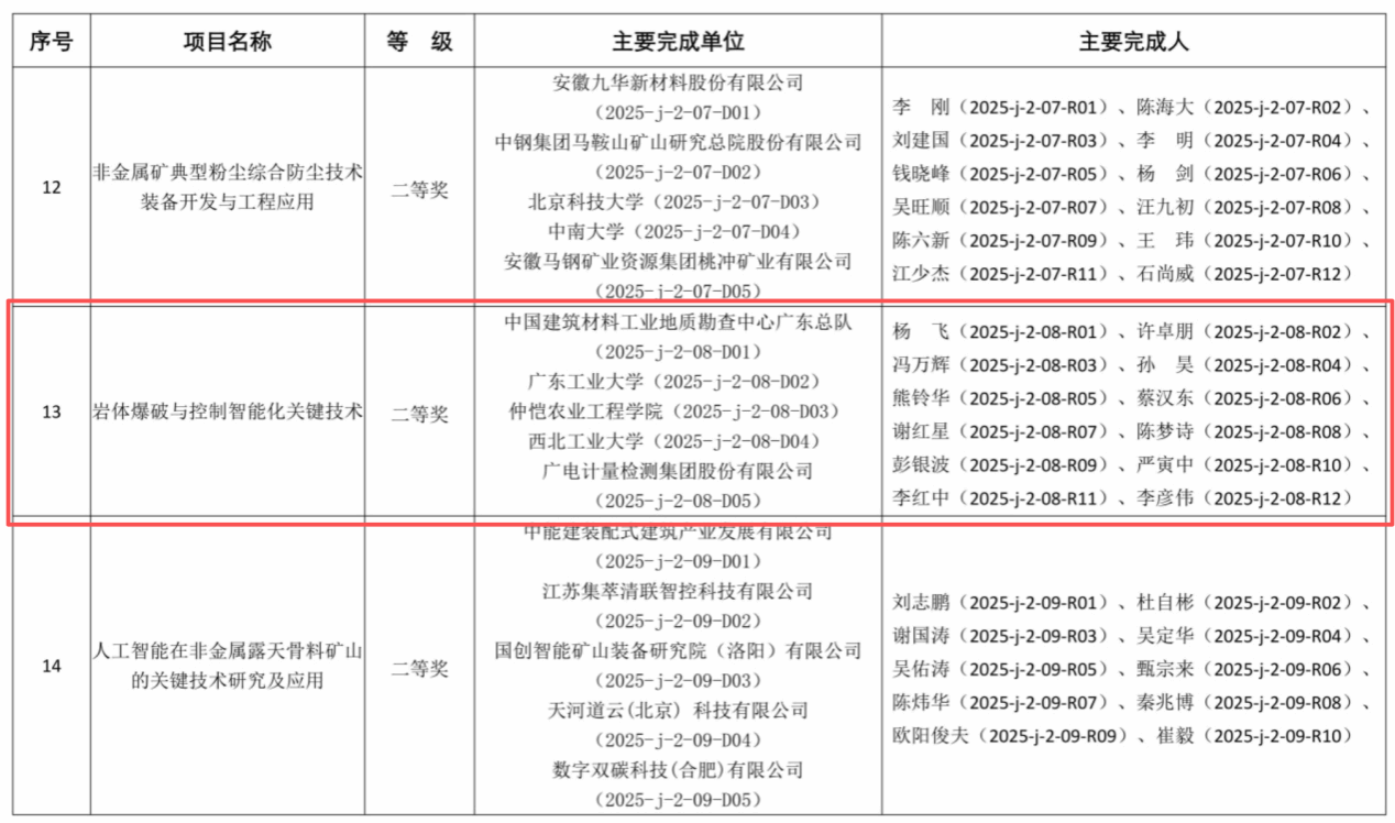 该项目由中国建筑材料工业地质勘查中心广东总队主导,联合广东工业大学、仲恺农业工程学院等单位共同完成。针对非金属矿山从“浅部易采”向“深部复杂”转变过程中爆破施工扰动范围大、安全风险高、环境污染严重等突出问题,项目组研发了数字孪生驱动的全过程安全管控技术及高强高韧紧急修复材料,构建了“爆破—防护—监测—修复”一体化的智能化技术体系。相关成果经鉴定达到国际先进水平,对非金属矿行业发展具有重要的引领作用。