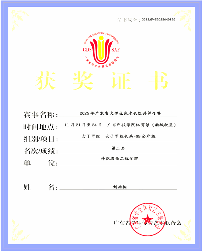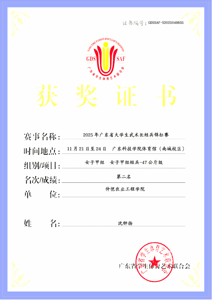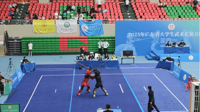 2025年广东省大学生武术长短兵锦标赛于11月21日至24日在广东科技学院(南城校区)举行。本届赛事规模创历届之最,共吸引40所高校的461名运动员参与角逐。比赛设甲组、乙A组、丙组三个组别,分设男子、女子各8个公斤级别,总计进行超过200场专业对抗。我校武术代表队在教练王玉立和黄继珍的率领下,派出6名运动员参赛。队员们不负众望,凭借过硬的技术实力与顽强的拼搏精神,在全省高校劲旅中脱颖而出,斩获2银1铜,并实现全员获奖的好成绩。